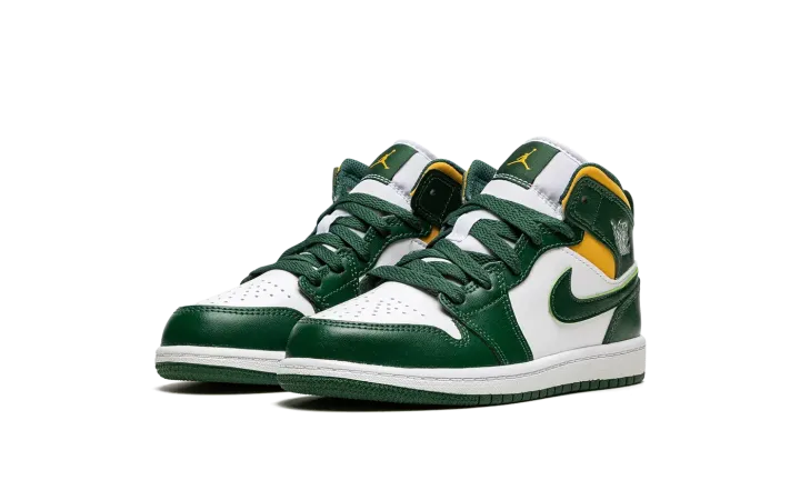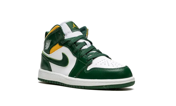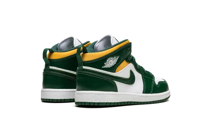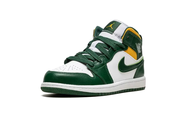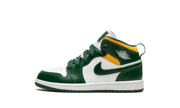 The Air Jordan 1 Mid PS "Sonics" is the preschool sizing of Michael Jordan's first signature shoe in the popular mid-top silhouette in a colorway that nods to the defunct NBA basketball team. The "Sonics" edition of the retro basketball shoe is an unofficial tribute to the Seattle Supersonics, the basketball team that relocated to Oklahoma City and became the Thunder in the late 2000s. As imagined, the colorway features the Sonics' former green, yellow, and white team uniform colors on its design. The toe and mid-panel are constructed in white leather. The overlay panels and Swoosh branding appear in a Noble Green hue. Pollen, or yellow, can be found on the collar beneath the green leather overlay with a white "Wings" logo on it.
