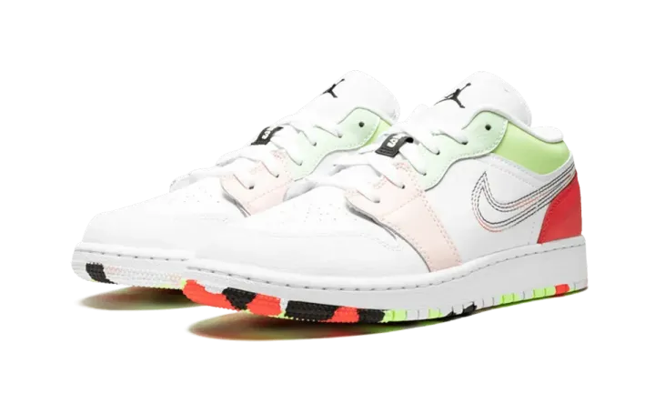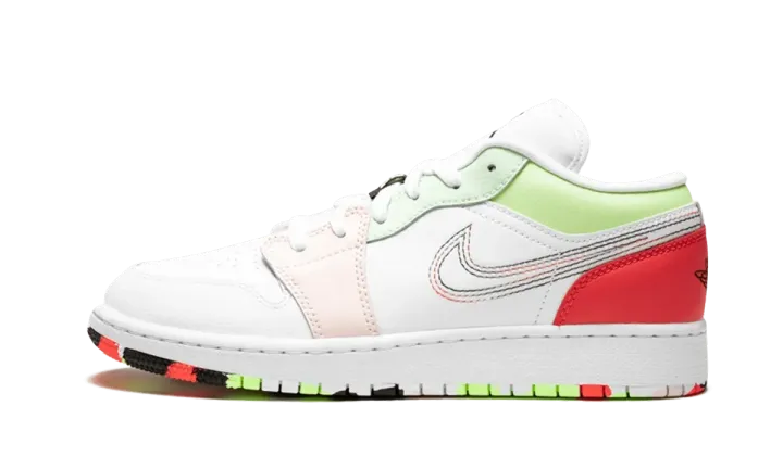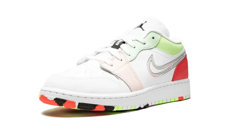 The Air Jordan 1 Low offers an enticing colorway for kids. White synthetic material holds down the toe box, tongue, and midfoot, while vibrant hues of red, pink, and pales shades of green cover the supportive overlays. Embroidered stitching on the side creates memorable multicolored Swooshes within a Swoosh. White laces and black Jumpman branding complete the top portion, while a colorful marbled outsole finishes the design on the bottom. The rubber sole of the Air Jordan 1 has a dynamic pivot circle that delivers durable traction.