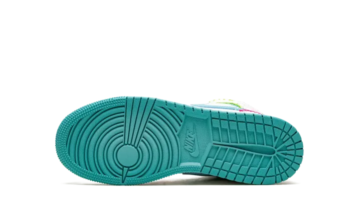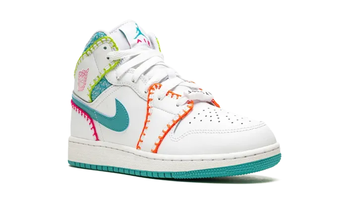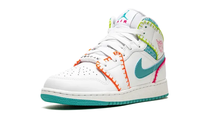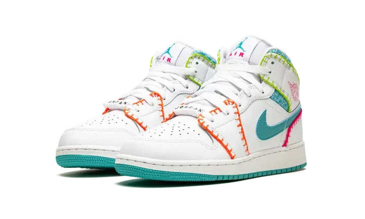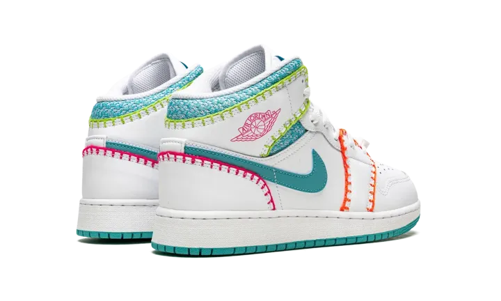 The Air Jordan 1 Mid GS "Multi-Knit" is the youth sizing of the mid-top lifestyle shoe in a colorway with a springtime vibe. Colorful accents abound on the "Multi-Knit" edition of the Jordan 1 Mid GS. The shoe's upper is constructed of white leather and features overlays accented with knit stitching in coral, pink, and lime green. The underlay panel on the collar is also designed in a knit textile, this time in blue. The same teal hue is used on the leather Swoosh that appears on either side of the shoe and on the Jumpman on the tongue. A pink "Wings" logo is found on the collar. The look is rounded into form with a lace dubrae with "JORDAN" branding in beaded letters.