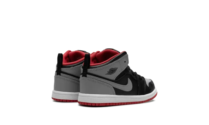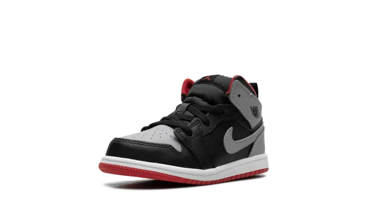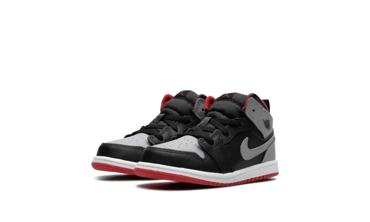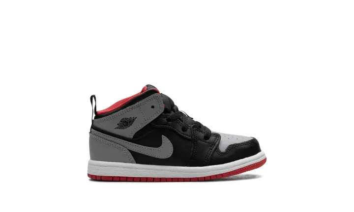 The Air Jordan 1 Mid TD "Black/Cement Grey" is the toddler sizing of the lifestyle shoe with a neutral-colored look. The "Black/Cement Grey" Jordan 1 Mid TD features a Cement Grey leather on the perforated toe, collar, and heel, and black leather on the toe cap, forefoot, eyelets, and mid-panel. A Cement Grey leather Swoosh appears on both sides, and a "Wings" logo is found on the collar. A Fire Red Jumpman is located on the tongue tag, while a pull tab on the heel assists with on/off wearability.