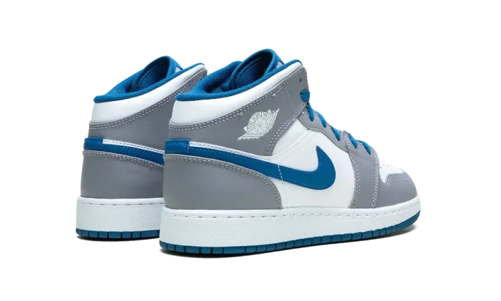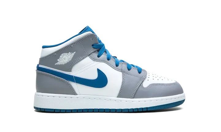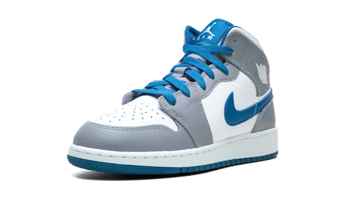 The Air Jordan 1 Mid GS "Cement/True Blue" is the youth sizing of the casual sneaker in a colorway that nods to Jordan Brand's history. The "Cement/True Blue" is loosely inspired by the classic Air Jordan 3 "Cement" theme as well as the model's "True Blue" color story. As you can see, the shoe culls inspiration from both colorways. The upper features a white leather base contrasted with Cement-colored leather overlays. A True Blue leather Swoosh logo appears on both sides of the shoe. The eye-pleasing shade of blue can also be found on the laces and nylon tongue. It also lands on the rubber outsole beneath the white rubber midsole. Release date: January 16, 2023