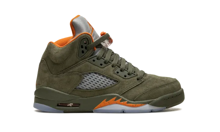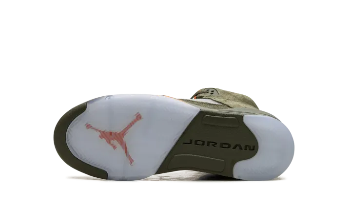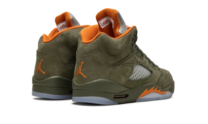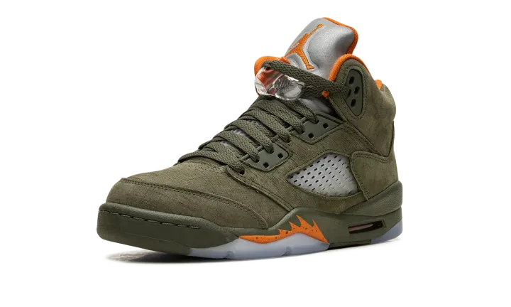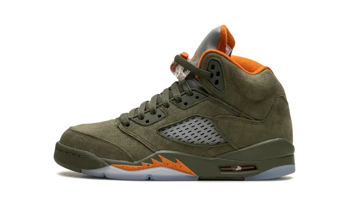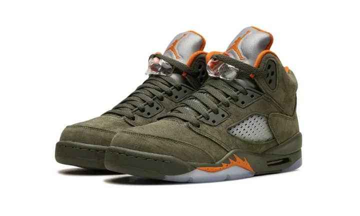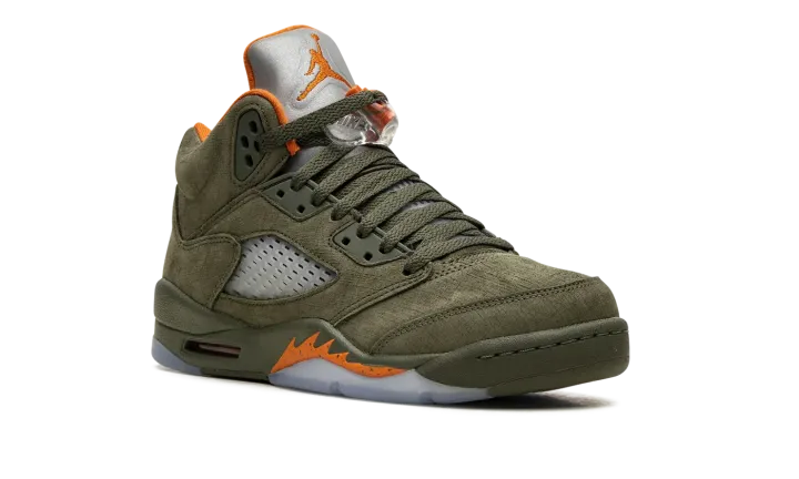 The Air Jordan 5 GS "Olive" is the youth sizing of the colorway that debuted in 2006 and was re-released in 2024. The Jordan 5 "Olive" was created as a lifestyle colorway in 2006 and brought back by Jordan Brand in 2024. The contemporary version of the shoe is identical to the original style from '06. The shoe features an Olive suede construction with translucent netting on both the mid-panel and on the tongue. A Solar Orange Jumpman appears on the silver reflective tongue and on the heel. Additional orange accenting is seen on the inner lining and on the shark tooth detailing on the forefoot of the olive midsole. An icy blue translucent rubber outsole completes the look.