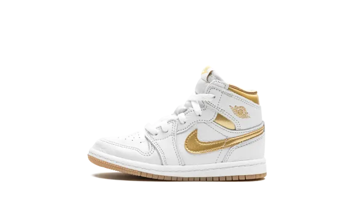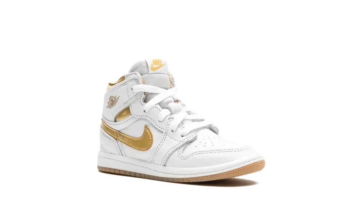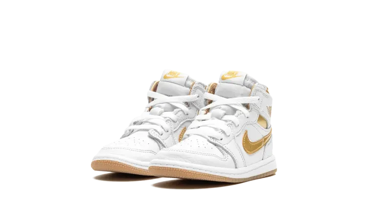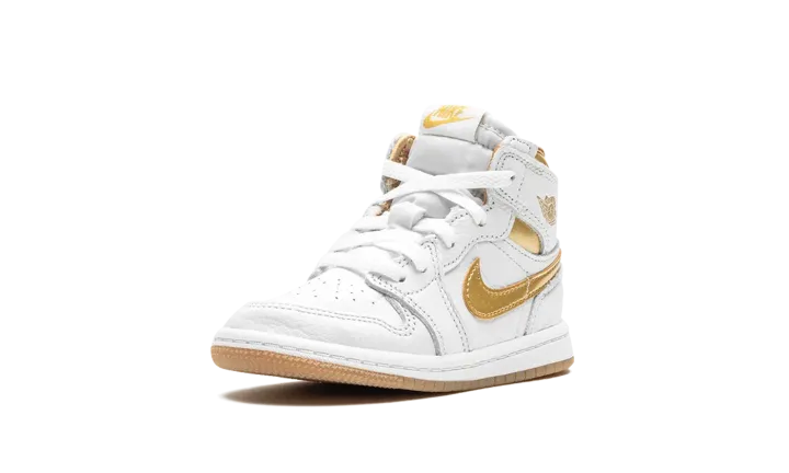 The Air Jordan 1 High OG TD "Metallic Gold" is the toddler sizing of the first Air Jordan shoe with flashy gold details. On this colorway, the Jordan 1 High OG is designed with a white leather construction, with white leather appearing on the base and overlays. A Metallic Gold leather Swoosh is seen on either side of the shoe, and a Metallic Gold "Wings" logo appears on the collar. More Metallic Gold is featured on the collar underlay and "Nike Air" branding on the tongue tag. Underfoot, a white midsole and gold outsole complete the look of this eye-catching shoe. Release date: February 14, 2024