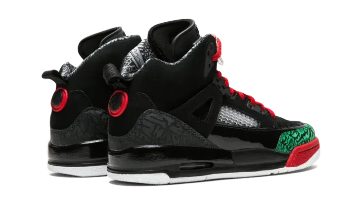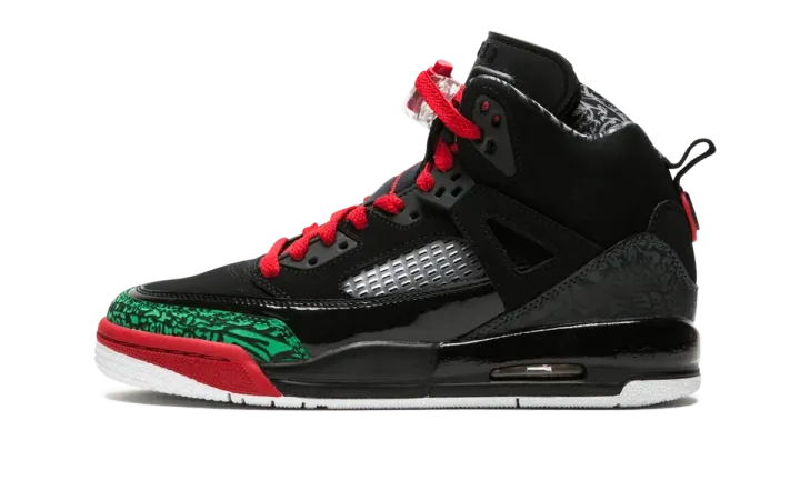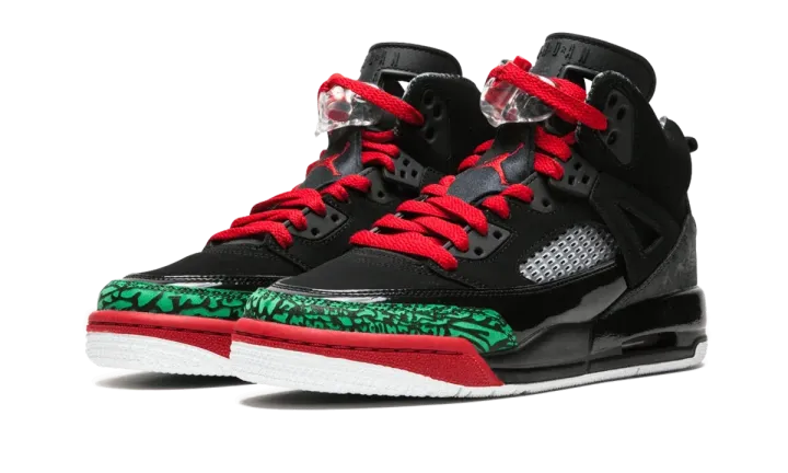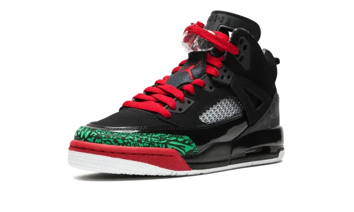 These Jordan Spizikes allow little guys to show their love for Spike Lee and Michael Jordan. The black and red Spizikes combine elements from multiple Jordans, including the iconic print of the Jordan 3s and the wings of the Jordan 4s. A bold green elephant print along the toe sets of the shoes, while crisp red laces enhance the all black suede upper.