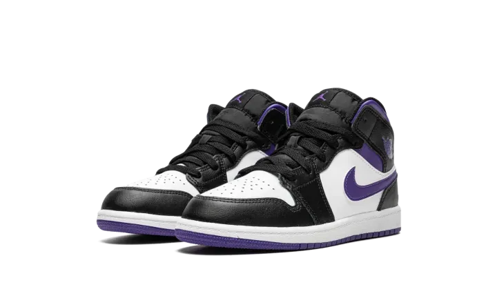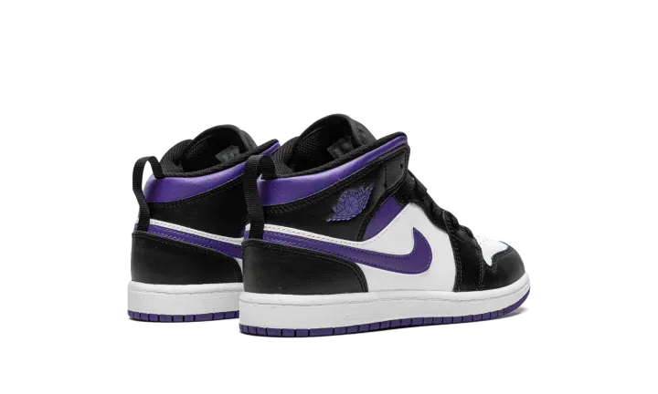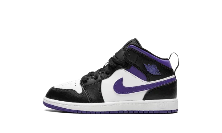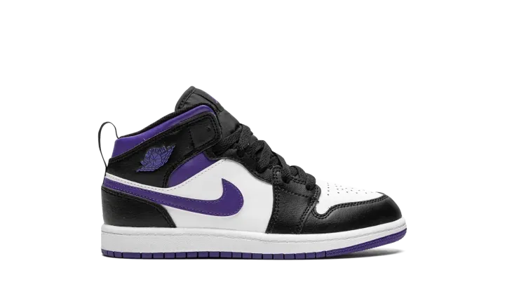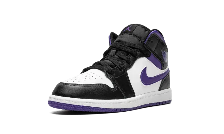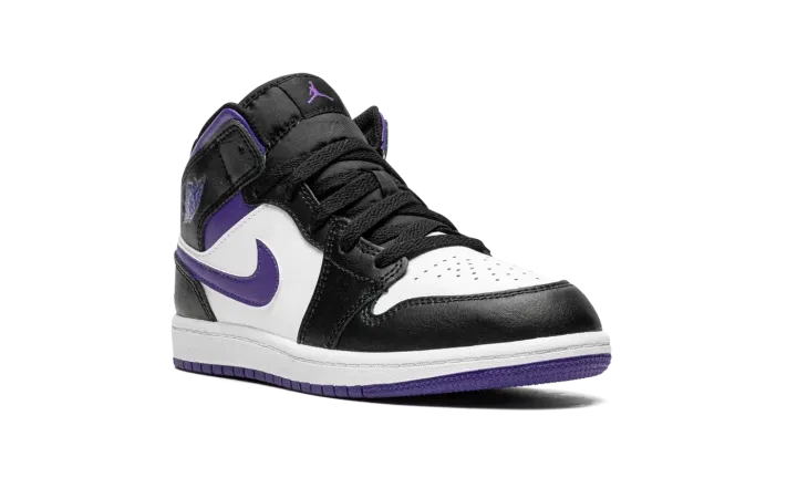 The Air Jordan 1 Mid PS "Dark Iris" is the preschool sizing edition of the popular lifestyle sneaker in a colorway with a regal tone of purple on its design. The "Dark Iris" features white leather on its perforated toe and mid-panel. Black leather is found on the overlays, including on the panels located on the toe cap, forefoot, eyelets, collar, and heel. A Dark Iris leather Swoosh appears on either side of the shoe. The purple hue also appears on the "Wings" logo on the collar, on the Jumpman on the tongue tag, and on the rubber outsole.