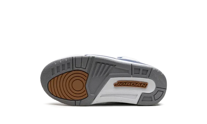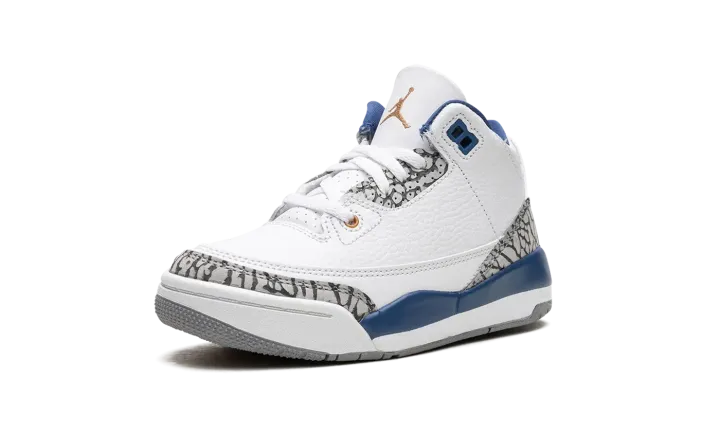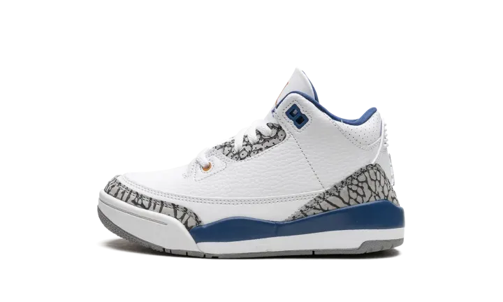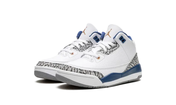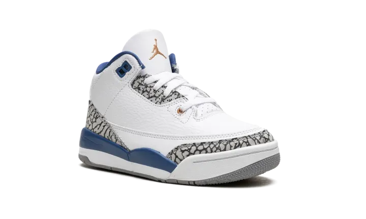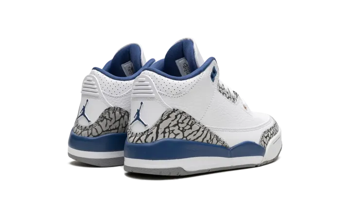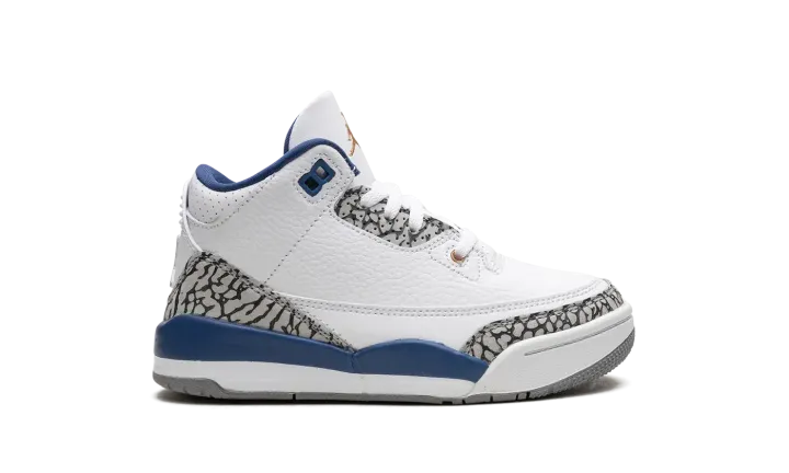 The Air Jordan 3 PS "Wizards" is the preschool sizing of the modern, retail version of the former player exclusive colorway for Michael Jordan. Originally an unreleased sneaker worn by Jordan during his tenure with the Washington Wizards in the early 2000s, the Jordan 3 "Wizards" was officially released by Jordan Brand in 2023. The colorway's white, blue, and elephant print accents nod to the Air Jordan 3 "True Blue's" color scheme, and its gold accents salute the Wizards' former team uniform colors. The shoe features a white leather construction with classic elephant print on the toe and heel. True Blue detailing comes into play on the eyelet panel and on the mudguard. A gold Jumpman is embroidered on the tongue. Release date: April 29, 2023