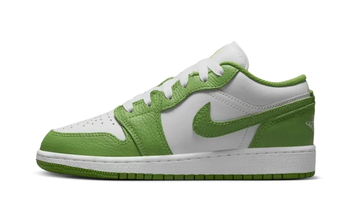 Let your young athlete pop in the Air Jordan 1 Low GS "Chlorophyll." This Grade School-sized classic low-top features a vibrant color scheme inspired by a legendary Nike hue. It pairs smooth White leather with rich Chlorophyll Green tumbled leather overlays and a black Swoosh. A flash of Lightning Yellow highlights the Jumpman logo on the tongue. With durable construction and an encapsulated Air-Sole unit, this sneaker is a fresh, energetic staple for all-day comfort and iconic style.