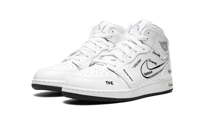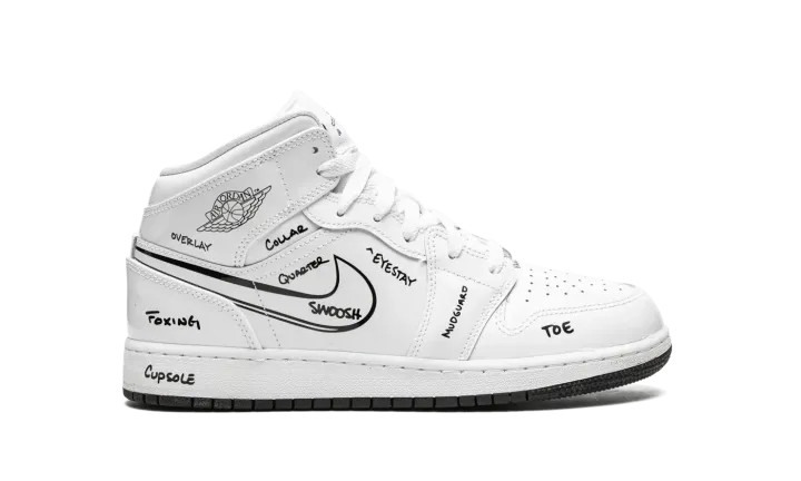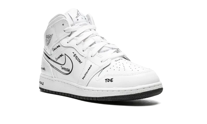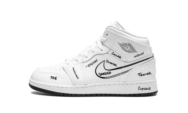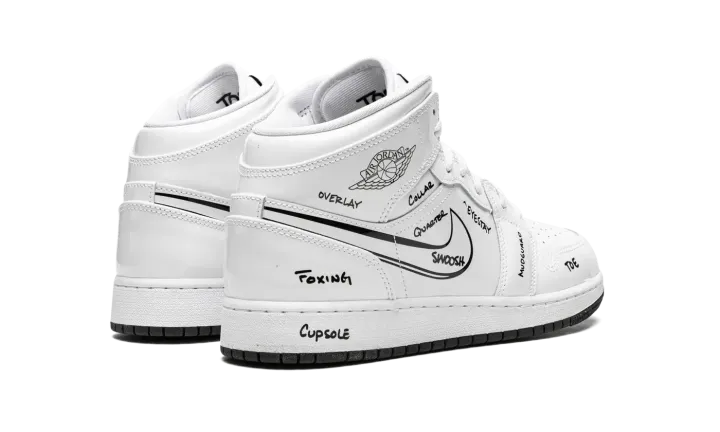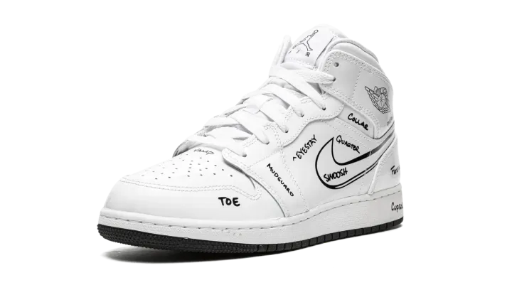 The Air Jordan 1 Mid GS "Schematic" is a kids-sized version of the popular mid-top lifestyle shoe in a colorway that features sketch detailing. Inspired by Nike's "Blueprint" collection from 2019, the "Schematic" Jordan 1 Mid GS is complete with a pre-production style appearance that includes notes on each of the shoe's design components. The shoe is complete with a white leather upper that is offset by black marks denoting elements such as "toe," "mudguard," "eyestay," and more. The etchings are meant to educate kids on the different components of a shoe.