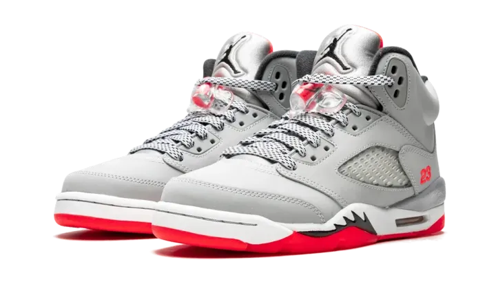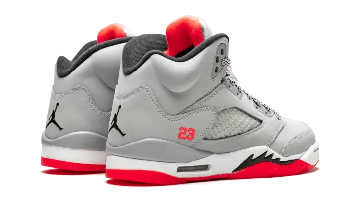 A 2015 release of the Air Jordan 5 exclusively for girls, this appealing colorway features a Wolf Grey upper with black and Hot Lava accents. Striped laces add a nice finishing touch.