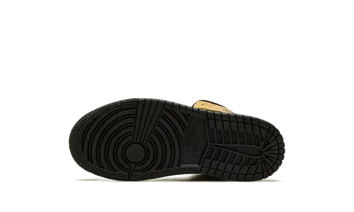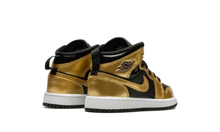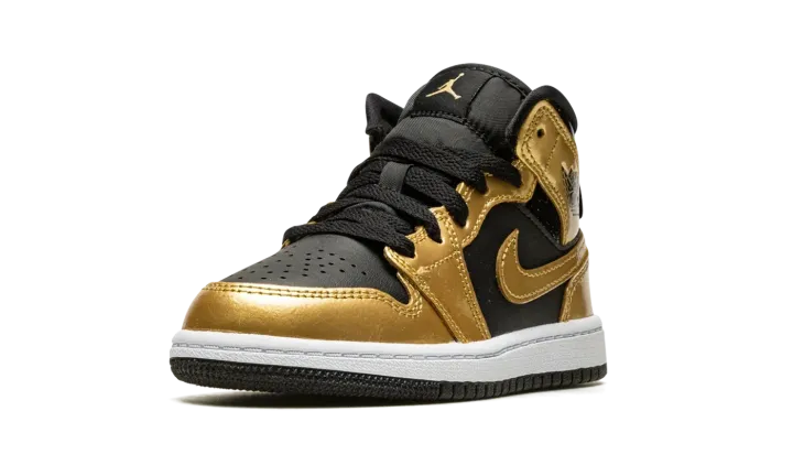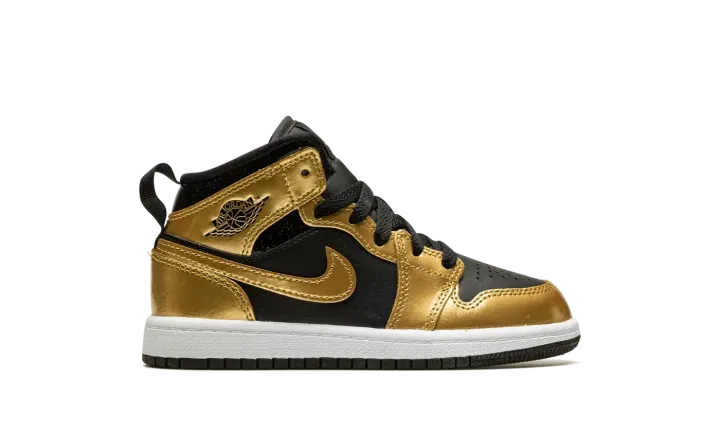 The Air Jordan 1 Mid PS "Metallic Gold" is the preschool sizing of the popular lifestyle shoe in a can't-miss colorway with gold accenting. The "Metallic Gold" Jordan 1 Mid features a black leather base with Metallic Gold leather overlays on the toe, forefoot, collar, heel, and on the leather Swoosh found on both sides. A black "Wings" logo appears on the collar overlay while a gold Jumpman is found on the black nylon tongue tag on the black nylon tongue. The white rubber midsole and black rubber outsole complete the look. Release date: October 6, 2022