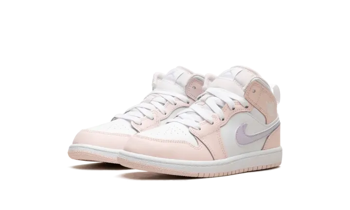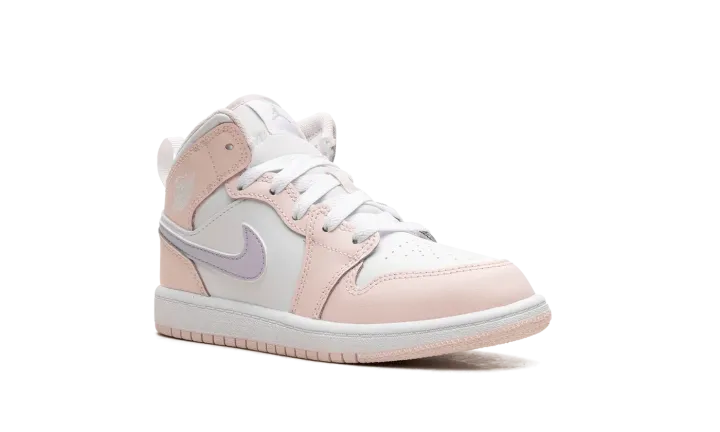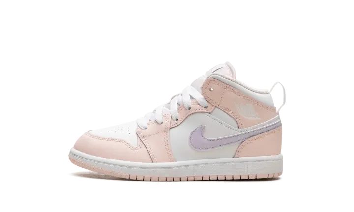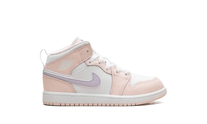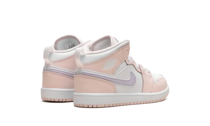 The Air Jordan 1 Mid PS "Pink Wash" is the preschool sizing of the popular shoe with an appealing pastel color scheme. The upper has a white leather base and Pink Wash leather overlay panels that give the shoe an eye-grabbing look. A Violet Frost Swoosh appears on the sides, while a white "Wings" logo appears on the collar. An added pull tab on the heel assists with on/off wearability for children.
