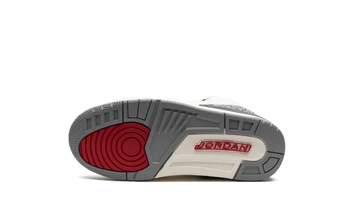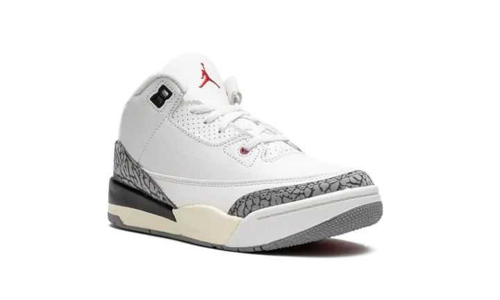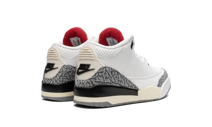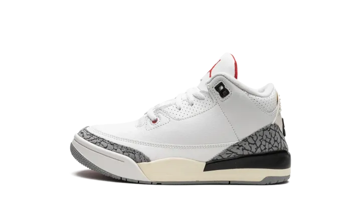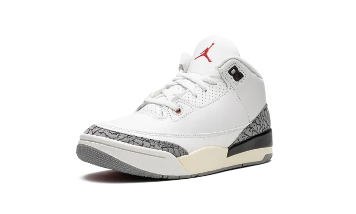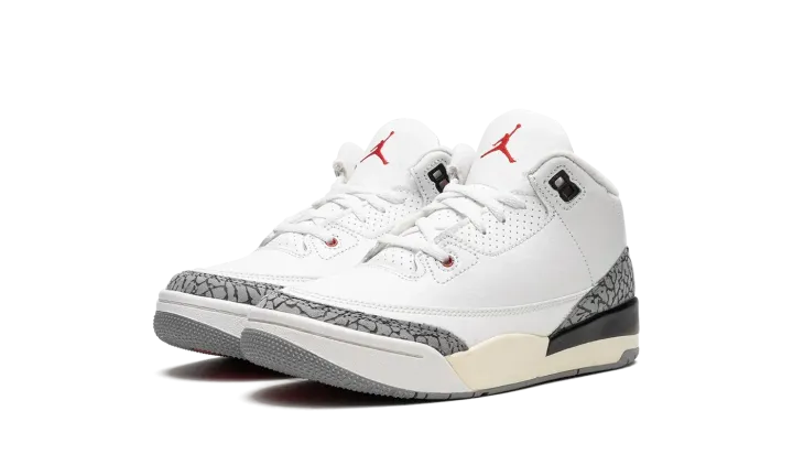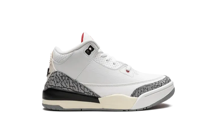 The Air Jordan 3 PS "White Cement Reimagined" is the preschool sizing of the retro basketball sneaker that replicates the model's original design. Released by Jordan Brand in 2023 to celebrate the iconic Jordan 3's 35th anniversary, the "White Cement Reimagined" retains the look of the model's "White Cement" colorway with accurate-to-original panels, colors, and overall shape. Faithful to the 1988 version of the Jordan 3 "White Cement," the "Reimagined" features a higher-cut ankle collar inspired by the OG Jordan 3's design. It also is equipped with a white leather upper with contrasting grey elephant print on the toe and heel, which has also been modified to look like the detailing on the original Jordan 3. Release date: March 11, 2023