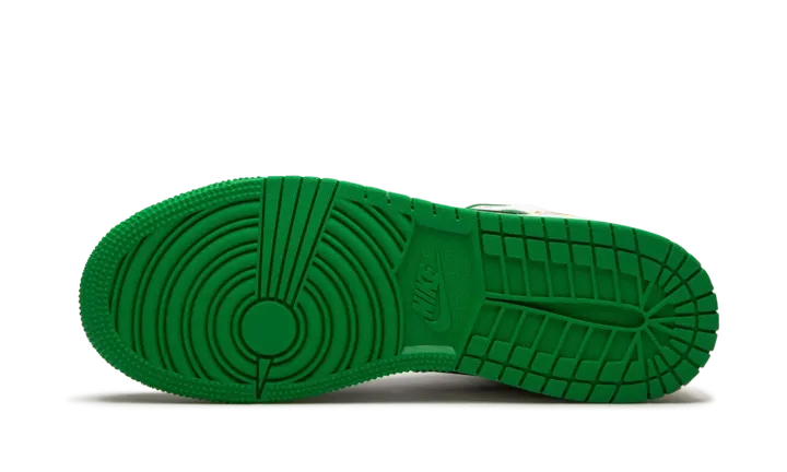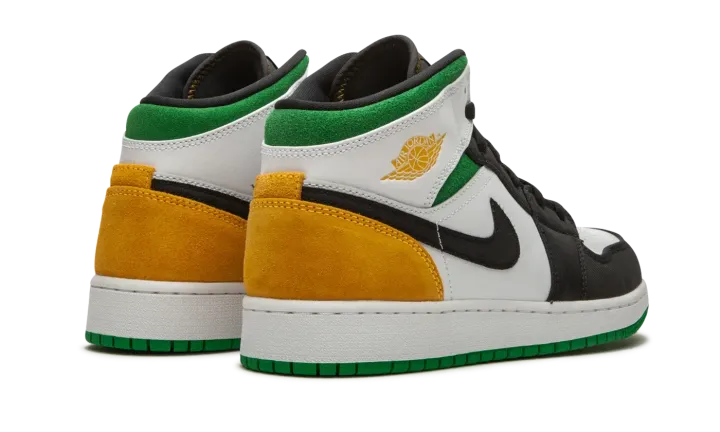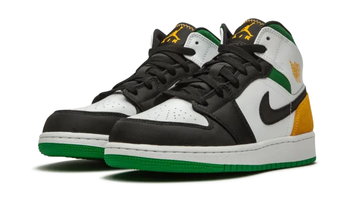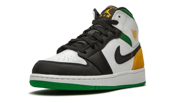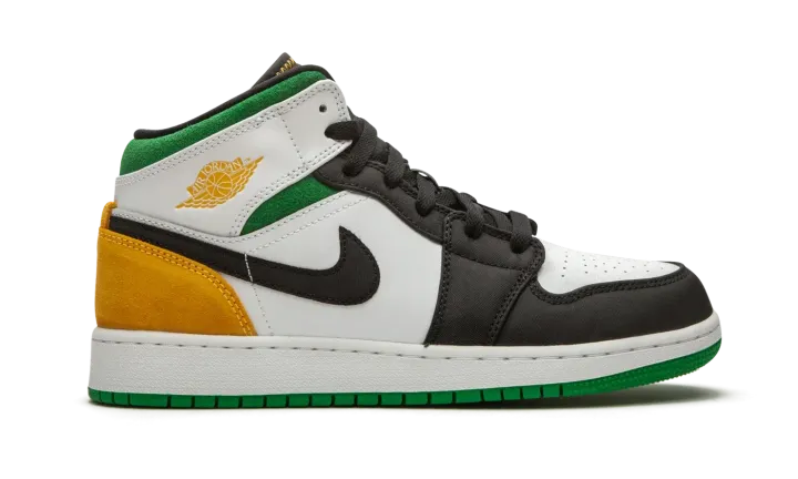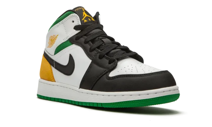 The Air Jordan 1 Mid GS "Laser Orange/Lucky Green" is the youth sizing of Michael Jordan's first signature shoe in a colorway reminiscent of the team uniform colors of the Boston Celtics. Though not officially associated with the NBA team, the "Laser Orange/Lucky Green" design nonetheless displays a little "Luck of the Irish" in its appearance. The perforated toe, mid-panel, and collar are finished in white leather for a clean look. Contrasting black nylon overlays are found on the forefoot, Swooshes, tongue, and eyelets, while a Laser Orange suede panel adorns the heel. An orange "Wings" logo marks the collar and green suede accenting is located on the collar. Bold yellow Jumpman branding appears on the black nylon tongue tab.
