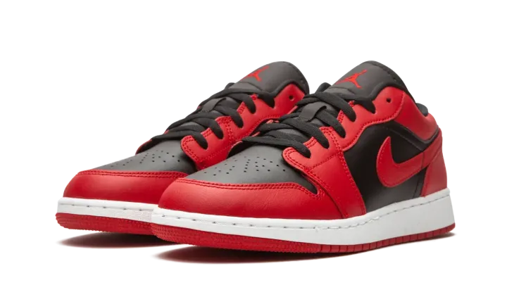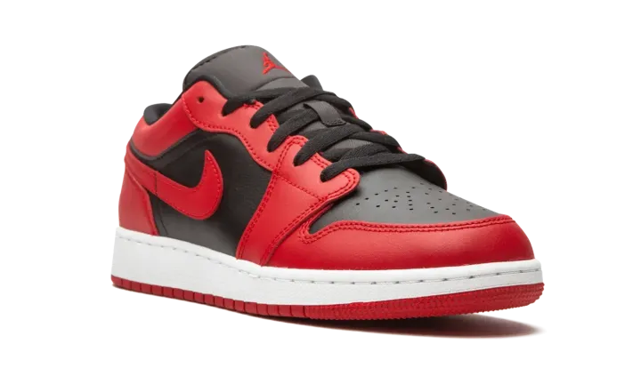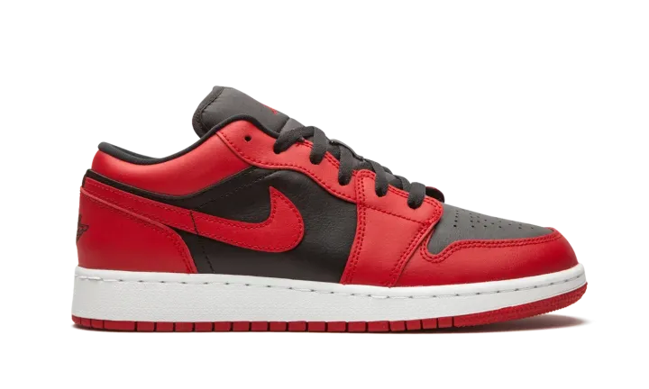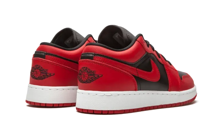 The Air Jordan 1 Low GS "Reverse Bred" is the youth sizing of Michael Jordan's first signature shoe that flips the iconic "Bred" color block for a fresh new style. The design is reminiscent of the Jordan 1 '85 "Varsity Bred" in that it features red leather overlays on the forefoot and eyelets that are contrasted by a perforated black leather toe. The original "Bred" displayed black overlays and a red leather toe. As for the styling of the rest of the shoe, additional red leather detailing can be found on the collar and heel. Classic "Wings" embroidery is located on the heel. A mini red Jumpman resides on the black nylon tongue to round out the design of this Jordan 1 Low "Reverse Bred" fitted in youth sizing.
