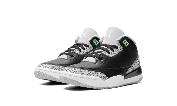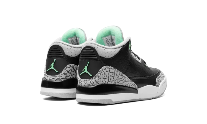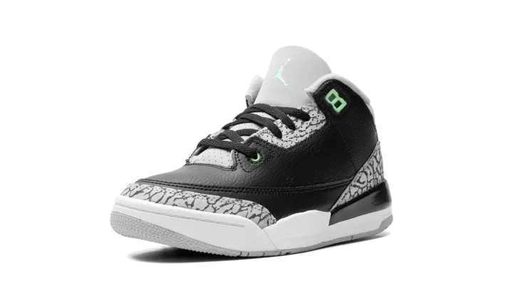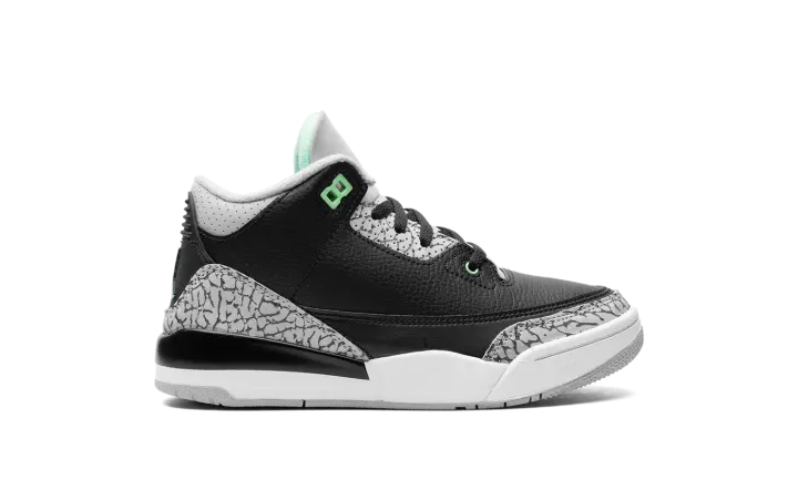 The Air Jordan 3 PS "Green Glow" is the preschool sizing of Michael Jordan's third signature shoe in a colorway loosely inspired by the model's original "Black Cement" style, but with a few changes. Like the Jordan 3 "Black Cement," the "Green Glow" features a black leather upper and grey elephant print details, but with light green accenting instead of the red accenting found on the "Black Cement." Specifically, Green Glow accenting appears on the eyelets, on the Jumpman branding on the tongue and heel, and on the "Jordan" logo on the outsole. A black painted mudguard appears on the heel above the white midsole. A small visible Air unit in the heel of the midsole gives the "Green Glow" a classic Jordan 3 look.