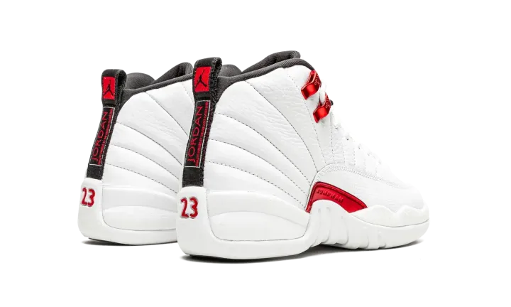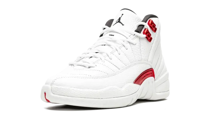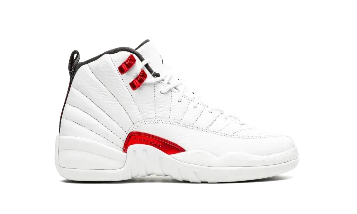 The Air Jordan 12 GS "Twist" is the youth sizing of Michael Jordan's twelfth signature shoe in a colorway inspired by the Chicago Bulls's team uniform colors. With its predominantly white-and-red color block, there is every reason to believe that had the "Twist" been included as part of Nike's launch of the retro basketball shoe in 1997, "His Airness" would have worn the style on court with the Bulls. Design wise, the "Twist" features a white leather construction with contrasting University Red accents on the "Jumpman" plate on the white midsole and on the top eyelets. An embroidered black Jumpman is stitched onto the white leather tongue above the embroidered "Two 3" branding. The white pebbled leather mudguard brings a classic design element to the look of the "Twist." Elsewhere, red "23" branding can be found on the back of the shoe below the "Jordan" detailing on the heel. Release date: July 24, 2021