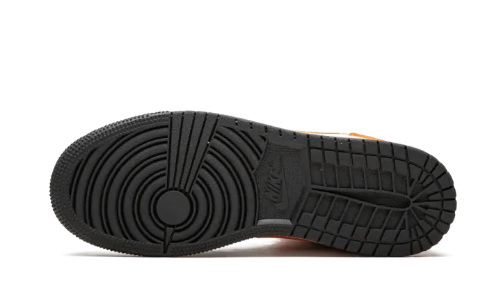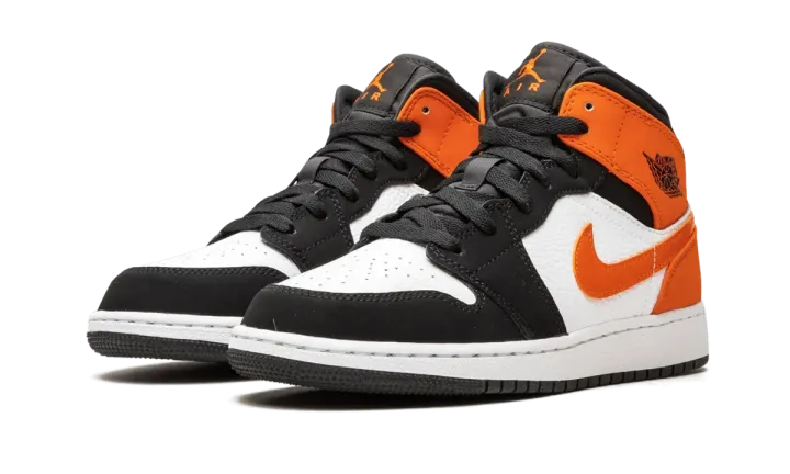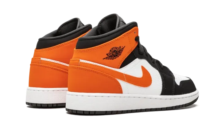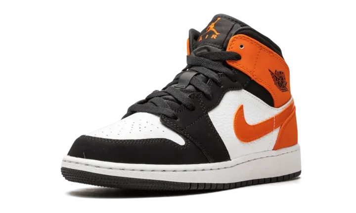 The Air Jordan 1 Mid GS "Shattered Backboard" is the youth sizing of the mid-top Jordan 1 featuring the coveted "SBB" color scheme. Inspired by an overseas exhibition game in 1985 in which Michael Jordan broke the backboard following a monsterous slam dunk, the "Shattered Backboard" Air Jordan 1 has gained popularity as one of the best non-OG colorways in the lineage of Jordan 1 releases. The upper includes a tumbled white leather base with contrasting black leather Swooshes and a Starfish orange leather heel and ankle collar. Black nubuck overlays as well as a black nylon tongue, laces, and wings logo on the ankle complete the look of the upper. Below, a white rubber midsole with a black outsole round out the look of the design. The grade school sizing of the Air Jordan 1 Mid "Shattered Backboard" was released in Summer 2019.