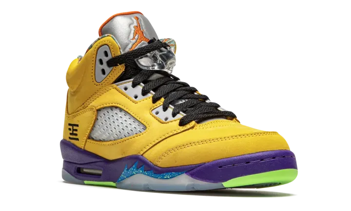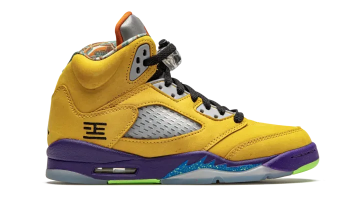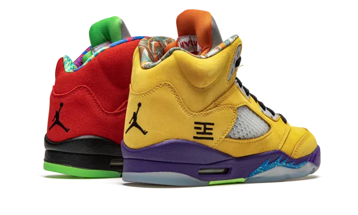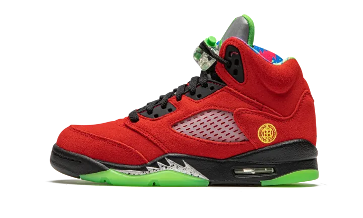 The Air Jordan 5 GS "What the" is the youth sizing of the mash-up colorway that honors the 30-year anniversary of Michael Jordan's fifth signature shoe. Some of the model's most popular, non-original looks like the "Quai 54," "Raging Bull," and "Bel-Air" are referenced in the design of the "What the" Jordan 5. Breaking it down by shoe, the left shoe features the "Raging Bull's" supple all-red suede upper with "Quai 54" accenting on the shark tooth midsole and tongue. The right shoe displays an all-yellow nubuck build referencing the sought-after "Tokyo T23" colorway, with the "Army Green's" silver and orange tongue and the "Bel-Air's" shark tooth motif on the midsole. Consistent on pairs are the nods to the "Tokyo T23" and "Shanghai" colorways with emblems from the two design embroidered on opposite heels. Release date: November 7, 2020.