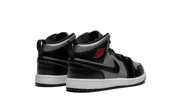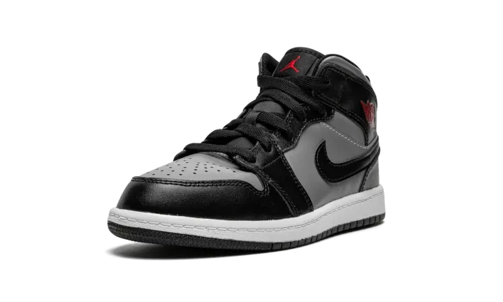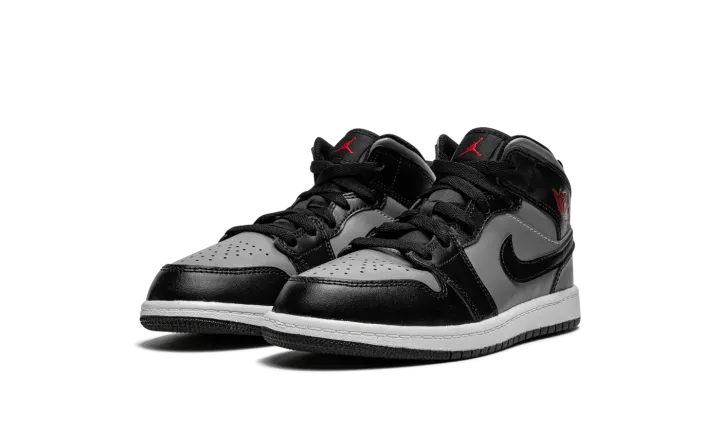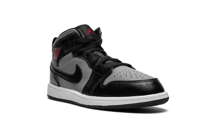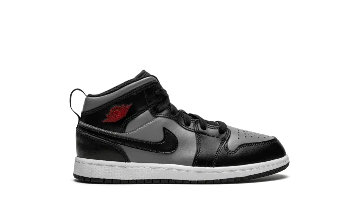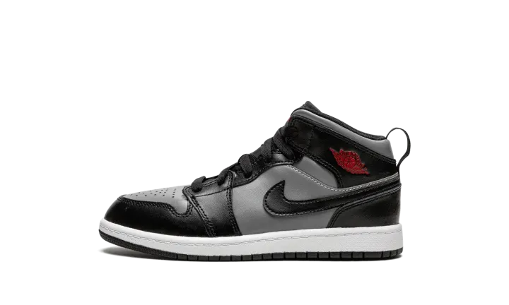 The Air Jordan 1 Mid PS "Black/Shadow Grey" is the preschool sizing of Michael Jordan's first signature shoe in a mostly two-tone, grey-and-black colorway that looks to the shoe's original "Shadow" makeup. AKA the "Shadow/Red" colorway, this is a versatile look for the Air Jordan 1 Mid that features Particle Grey leather on the perforated toe, mid-panel, collar, and heel. Contrasting black leather appears on the overlays and Swoosh branding. The two-tone appearance is similar, but not a direct one-to-one, of the Air Jordan 1's original "Shadow" colorway. A Gym Red "Wings" logo can be found on the collar and a red Jumpman with "Air" detailing appears on the black nylon tongue tag. A black nylon tongue, white rubber midsole, and black outsole complete the look.