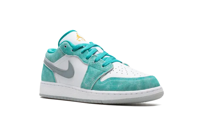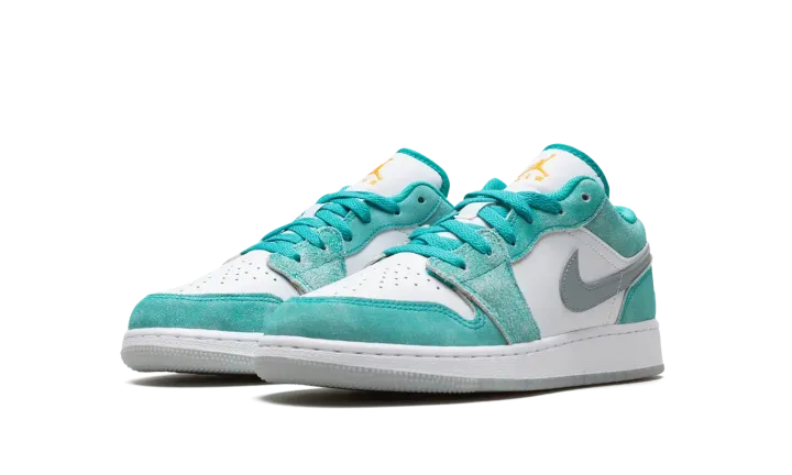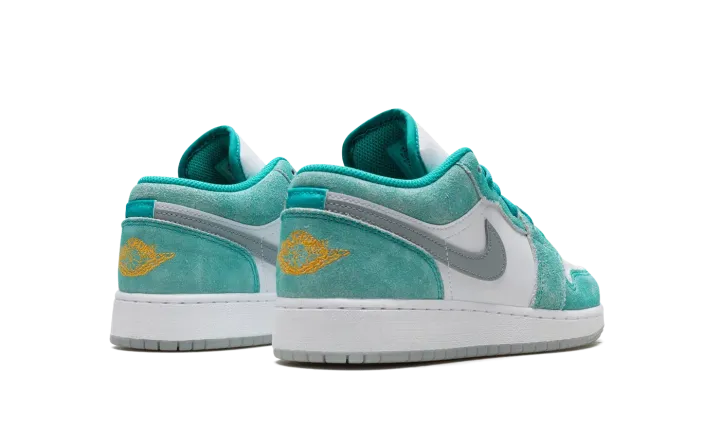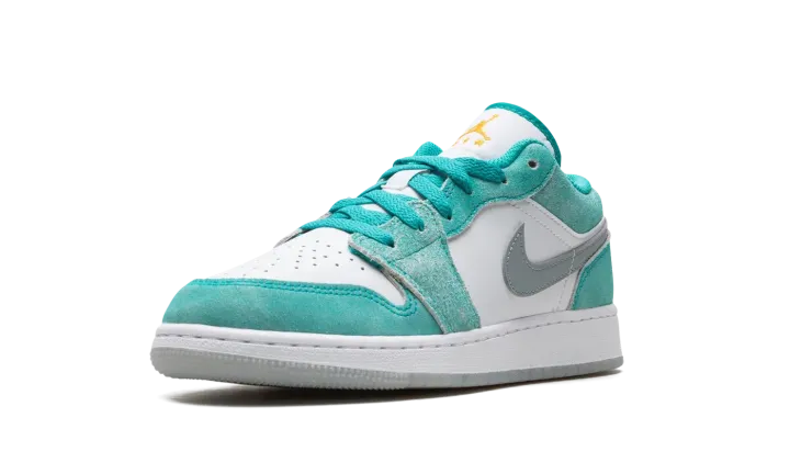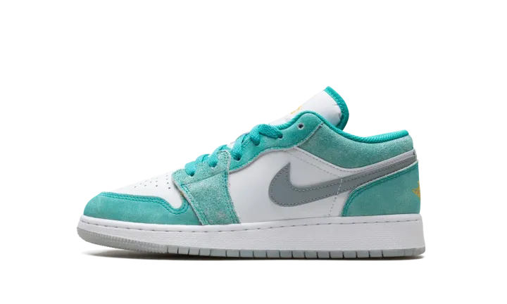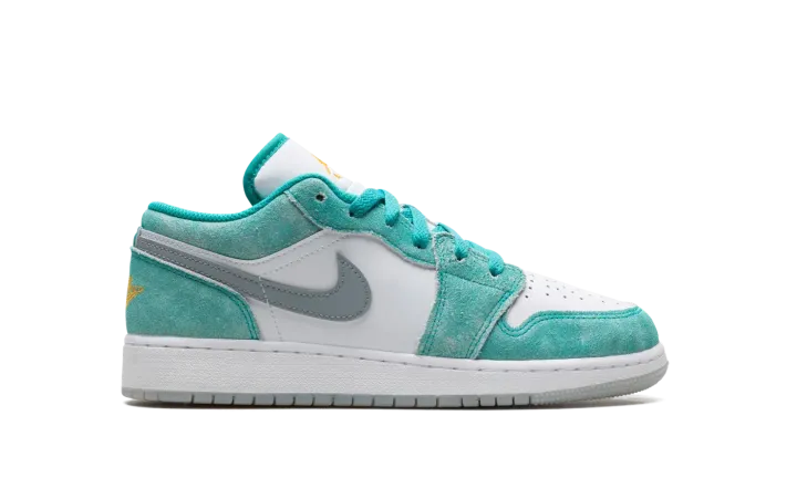 The Women's Air Jordan 1 Low GS "New Emerald" is the youth sizing of the colorway that calls to mind the two-tone color block of the original Nike Dunks from 1985. A classic look no matter which shoe it loosely mimics in appearance, the "New Emerald" features a white leather base with New Emerald-colored suede overlays and a dark mint green leather Swoosh. A yellow "Wings" logo is embroidered on the heel and a yellow Jumpman appears on the tongue. The eye-pleasing green hue is also used on the laces. Finishing touches include a white midsole and teal-colored rubber outsole.