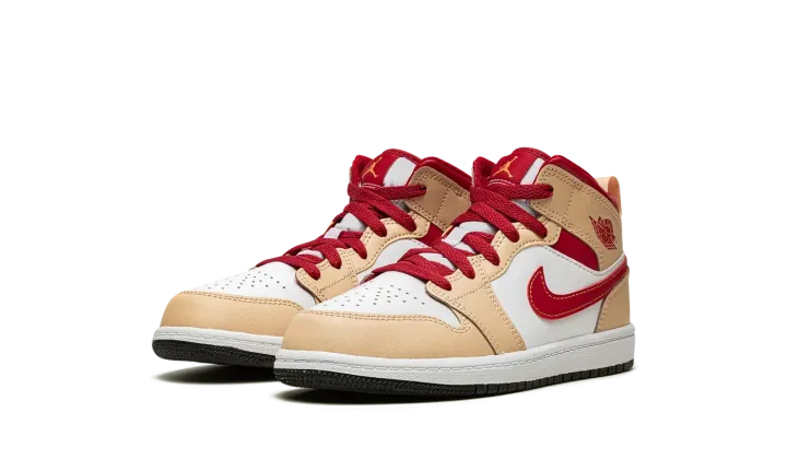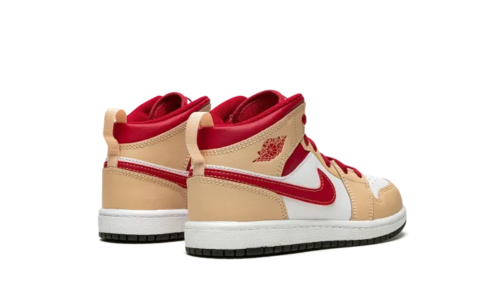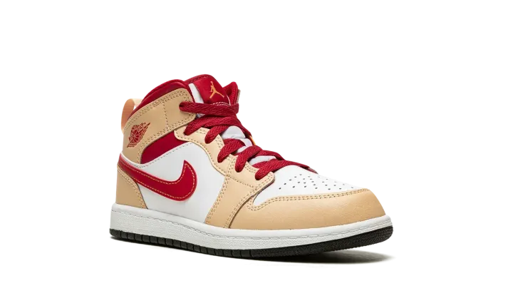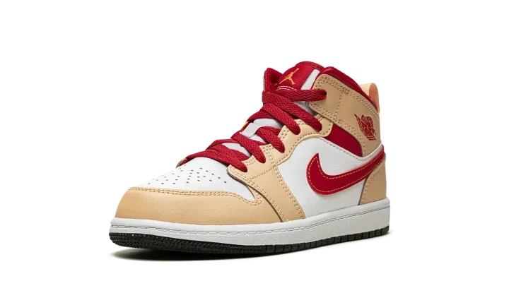 Jordan 1 Mid PS "White Onyx/Light Curry" is a versatile colorway of the popular mid-top shoe for preschoolers. The Air Jordan 1 Mid PS is the mid-top version of Michael Jordan's first signature shoe for kids and, like every Jordan 1 edition, is both comfortable and timeless in design. The perforated toe and mid-panel appear in white leather and the overlays are found in Light Curry-colored leather. A red leather Swoosh resides on either side of the shoe. Jordan Brand designs the shoe's "Wings" logo in red and the Jumpman on the tongue tag in gold. A red nylon pull tab on the back of the shoe assists with on/off wearability.