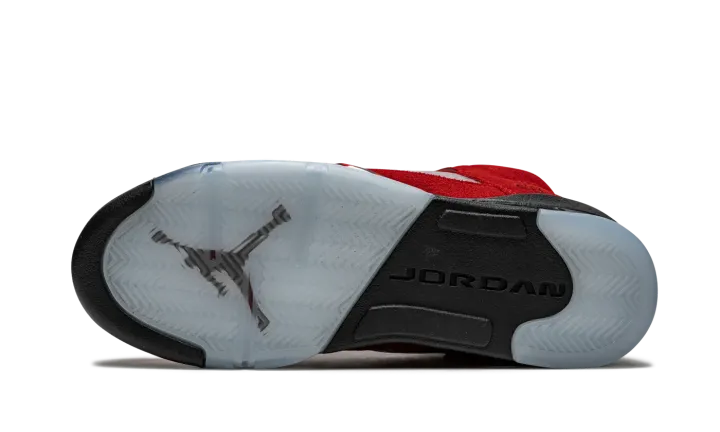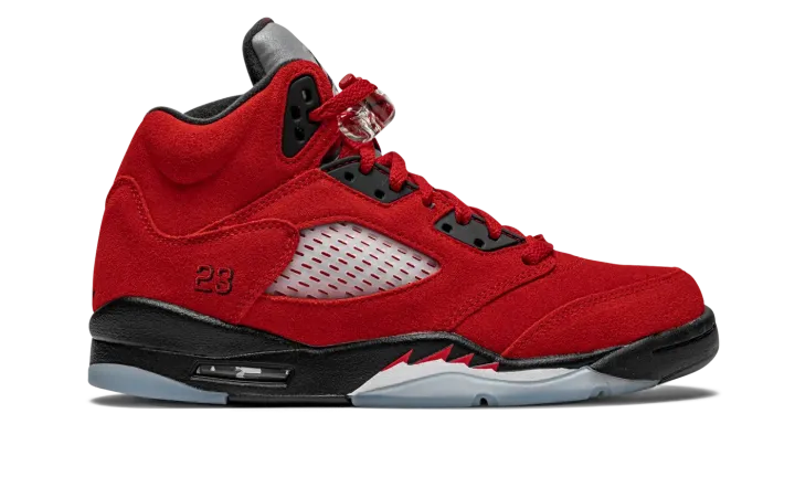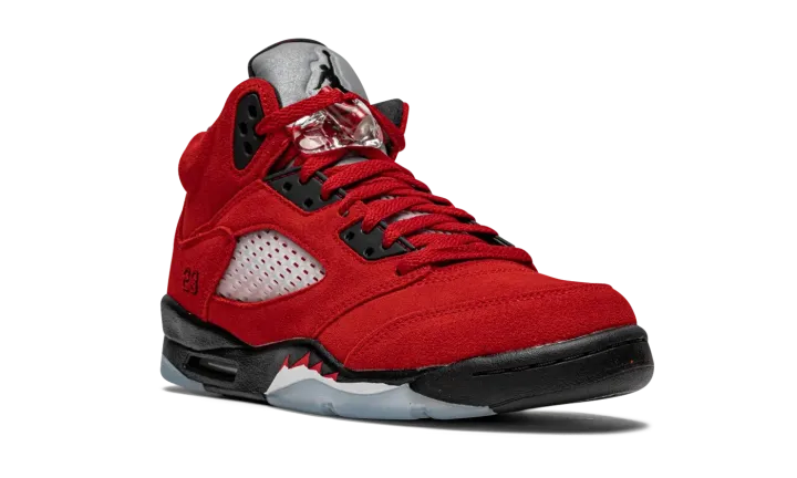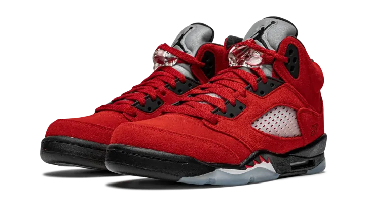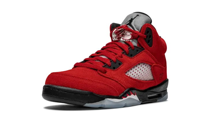 The Air Jordan 5 GS "Raging Bull" is the youth sizing of one of the most desirable non-original Air Jordan colorways. In 2009, the original "Raging Bull" or "Toro," as it's also been known as, appeared in the limited edition "Defining Moments Pack" that dressed Michael Jordan's fifth signature shoe in two styles: an all-red suede look and a reflective black design. The "DMP," for short, came packaged inside of a shoe box mimicking a wooden crate. The bundle remains extremely sought after to this day. Here, the modern re-release features a fiery shade of Varsity Red suede. Clear netting is located on the tongue and mid-panel. The model's silver reflective tongue is inspired by the look of the original Air Jordan 5 "Fire Red - Silver Tongue." A black embroidered Jumpman appears on the tongue and a tonal "23" logo with black outlining can be found on the lateral side, and a black Jumpman is embroidered on the heel. The clear lace lock and red laces salute the first "Raging Bull." Release date: April 10, 2021.