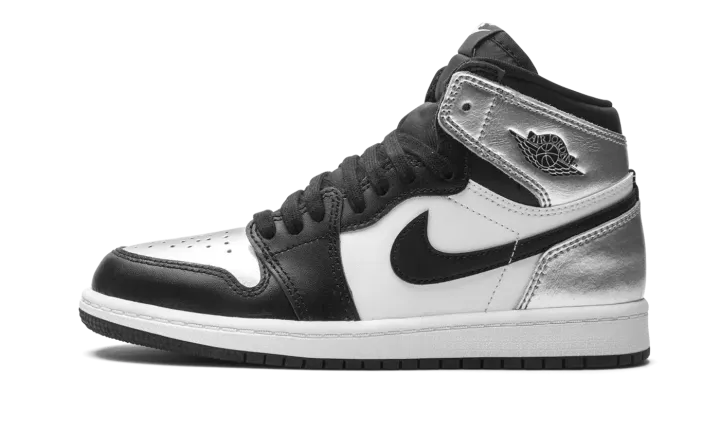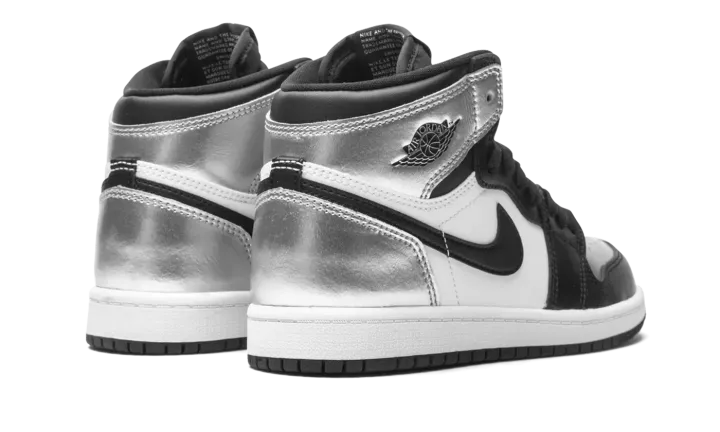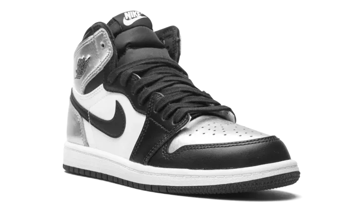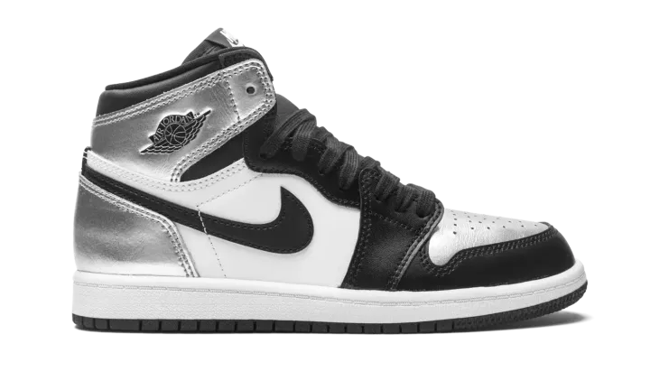 The Air Jordan 1 High PS "Silver Toe" is the preschool sizing of Michael Jordan's first signature shoe in a colorway that salutes a popular non-original style of the shoe. Released in February 2021, the "Silver Toe" draws favorably from Kawhi Leonard's rare "Think 16" design that was released in limited quantities in 2018 as an homage to the San Antonio Spurs' 2014 NBA Championship victory. Here, the look features similarly flashy silver metallic detailing on the back of the shoe and on the collar. A slightly less bright variation of the material can be found on the perforated toe. Contrasting black leather overlays on the forefoot, eyelets, collar, and on the Swoosh branding on either side of the shoe balance out the look. Additional branding appears in the form of a black "Wings" logo on the collar and white "Nike" detailing on the top of the black nylon tongue. The "Silver Toe" was originally released in full family sizing on February 19, 2021.