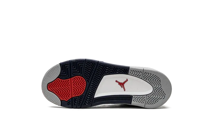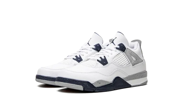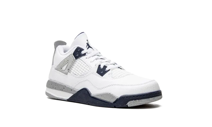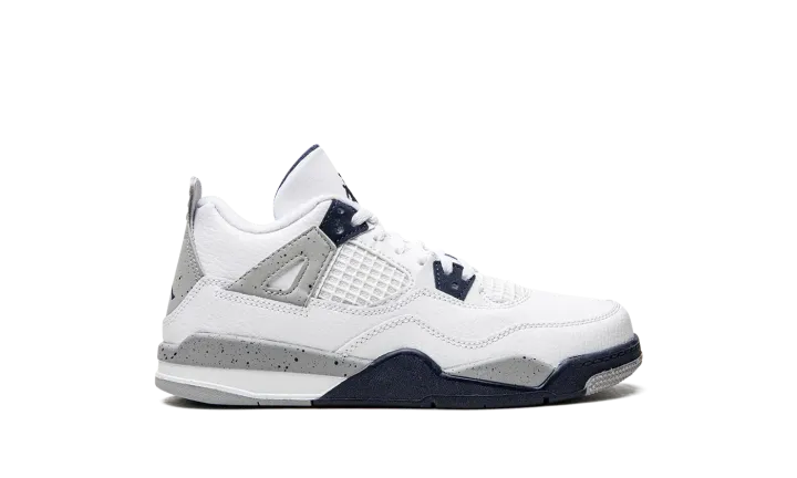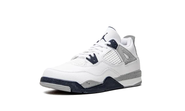 The Air Jordan 4 PS "Midnight Navy" is the preschool sizing of the colorway of retro basketball shoe inspired by the model's iconic "White Cement" style. The upper is constructed from white leather, save for the tongue and mid-panel which feature tonal mesh detailing. Midnight Navy plastic lace holders are found on the throat and collar. The Jordan 4's signature "Cement" detailing appears on the "Wings" tabs, on the mudguard, and on the Jumpman branded heel counter. Release date: October 29, 2022
