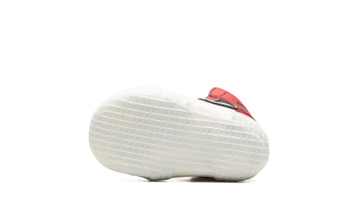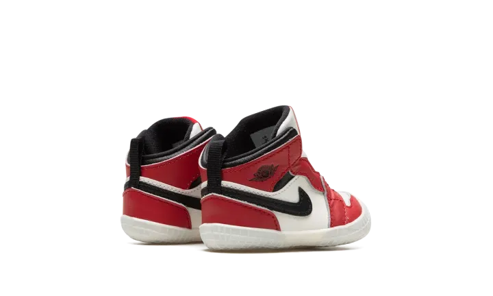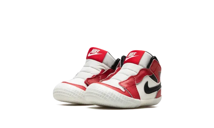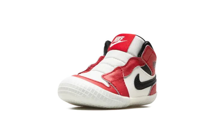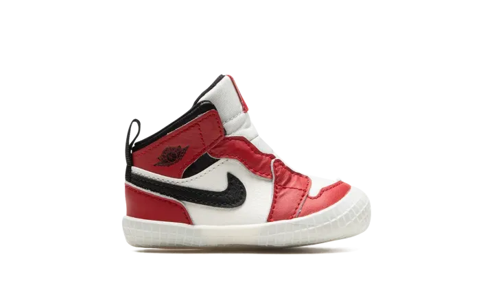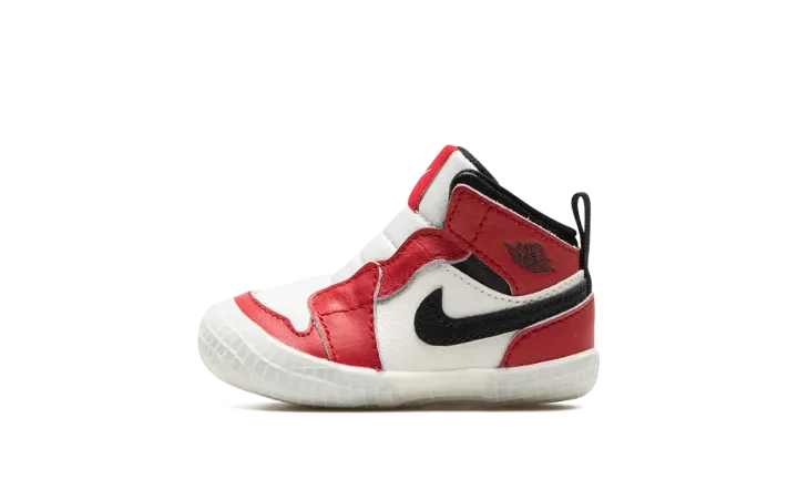 The Jordan 1 Crib "Lost & Found" is a miniature version of the original colorway of Michael Jordan's first signature shoe for infants. The "Lost & Found" edition of the Air Jordan 1 is a vintage-inspired take on the model's original "Chicago" colorway that was worn by Jordan during his rookie season in the NBA with the Chicago Bulls in 1984-85. Jordan Brand shrinks the "Lost & Found" down in size to fit the tiny feet of babies. The toe and mid-panel are constructed in white leather, which allows for the red leather overlays and black Swoosh branding to pop against the neutral base. A black "Wings" logo appears on the collar and a classic white Nike logo with a Swoosh is found on the red nylon tongue tag. Sans laces, the Jordan 1 Crib Bootie is an easy-wearing slip-on shoe for infants.