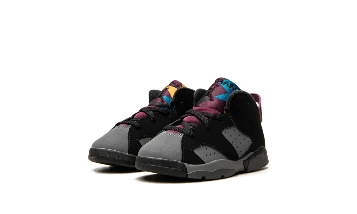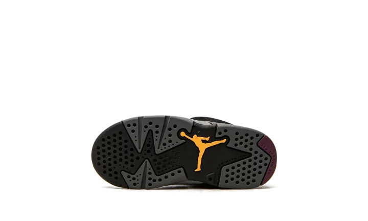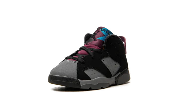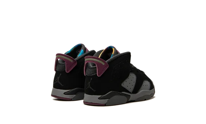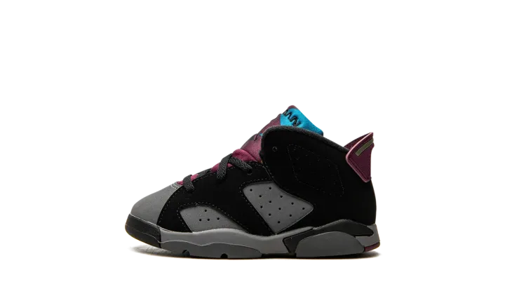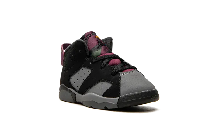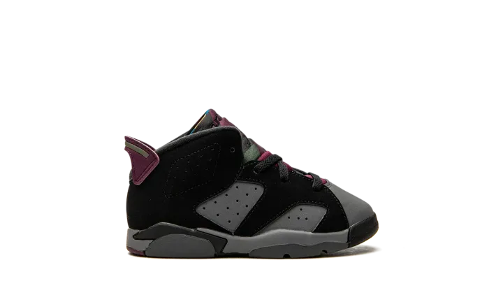 The Jordan 6 TD "Bordeaux" is the toddler edition of Michael Jordan's sixth signature shoe in a colorway that pays homage to the Air Jordan 7 style of the same nickname. Originally worn by Jordan during the '92 NBA All-Star Game, the Jordan 7 "Bordeaux" is the source of inspiration on this September 2021 release for the Air Jordan 6. The modern "Bordeaux" is complete with a grey synthetic nubuck base with perforations on either side. Contrasting black overlays break up the look. Bordeaux accenting is found on the neoprene tongue with black Jumpman branding and on the spoiler on the heel. "Air Jordan" branding appears on the semi-translucent tongue tab and a black Jumpman is stitched onto the back of the shoe. Release date: September 4, 2021