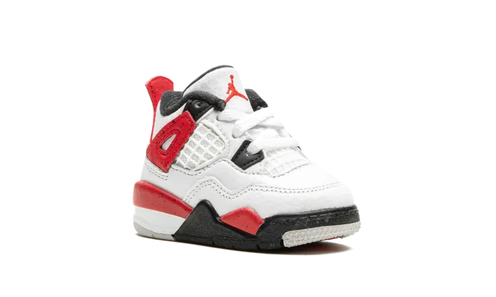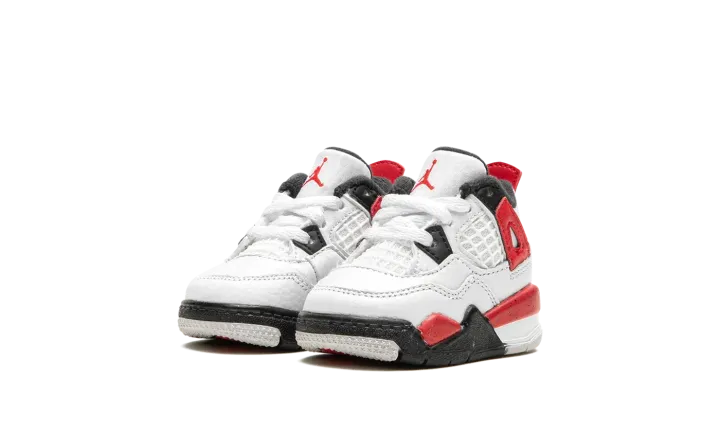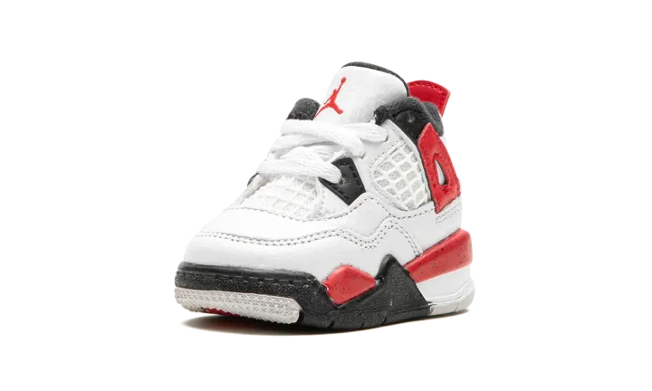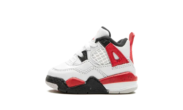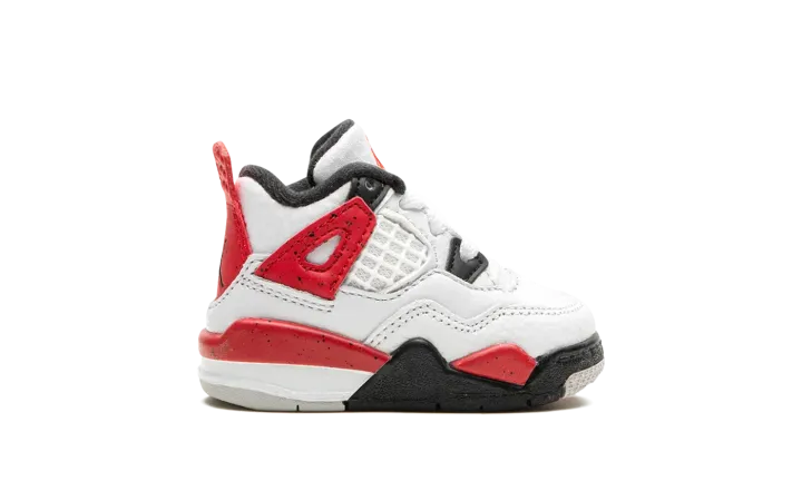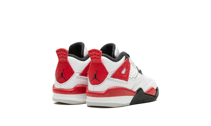 The Air Jordan 4 TD "Red Cement" is the toddler sizing of retro basketball shoe in a colorway inspired by the Jordan 4's original "White Cement" style. The "Red Cement' mimics the design of the model's "White Cement" colorway, but it features red detailing where the "White Cement" has grey cement patterning. The "Red Cement" features a white leather upper with tonal leather overlays and white netting on the tongue and mid-panel. The black eyelet panels are contrasted by Fire Red "wings" with speckle patterning. The fiery red speckled pattern also appears on the shoe's midsole and heel. A black Jumpman can be found on the tongue and heel. Release date: September 9, 2023