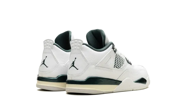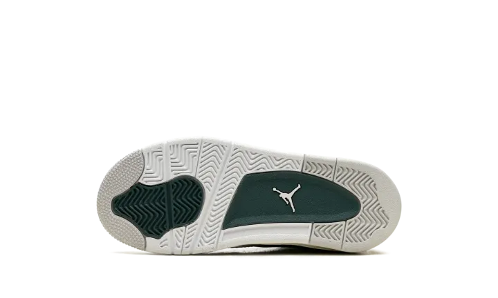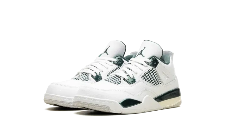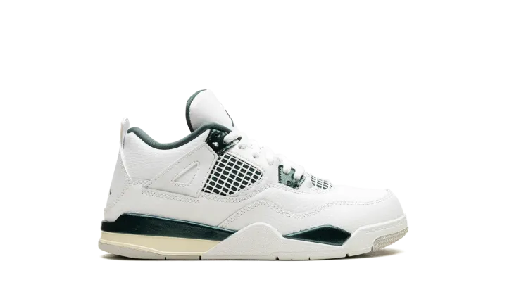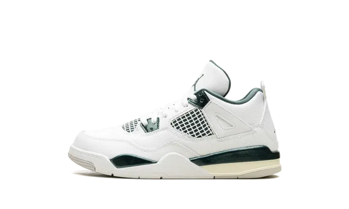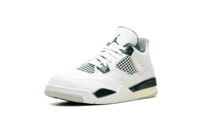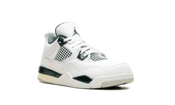 The Air Jordan 4 PS "Oxidized Green" is the preschool sizing of the colorway of Michael Jordan's fourth signature shoe with green details. A versatile look for the iconic sneaker, the upper features a white leather design with tonal netting on the mid-panel and tongue. Contrasting Oxidized Green accents can be found on the molded eyelets, the lace "wings," and on the heel tab, branded with a classic Jumpman logo. An additional Jumpman can be found on the tongue tag. Underfoot, an Oxidized Green mudguard, a vintage-inspired Sail midsole, and a visible Air unit in the heel complete the look. Release date: July 13, 2024