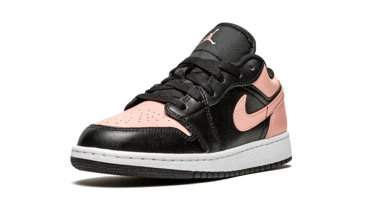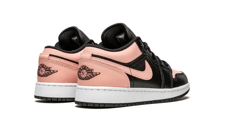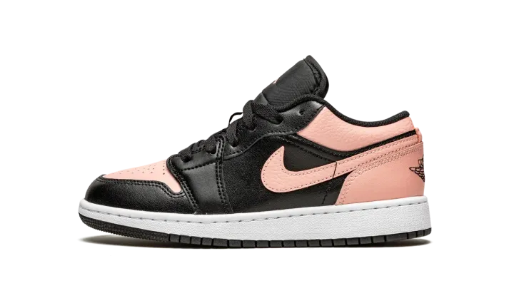 The Air Jordan 1 Low GS "Black/Arctic Orange" is a warm weather vibe for the kids edition of Michael Jordan's popular first signature shoe. Designed for the model's low-top silhouette, the "Black/Arctic Orange" colorway displays a predominantly two-tone, black-and-pink color block. Supple black leather appears on the forefoot, eyelets, mid-panel, and toe cap. Contrasting Arctic Orange leather detailing can be found on the Swoosh branding on both sides and on the perforated toe, collar, and heel. A black "Wings" logo is embroidered onto the heel. More Arctic Orange detailing comes into play on the Jumpman featured on the black nylon tongue. Underfoot, Jordan Brand pairs the white rubber midsole with a black outsole.
