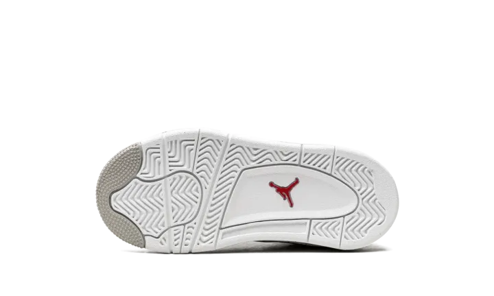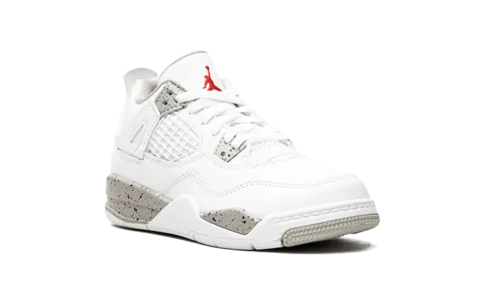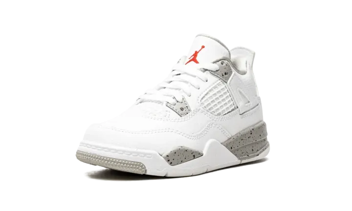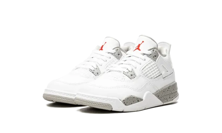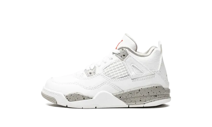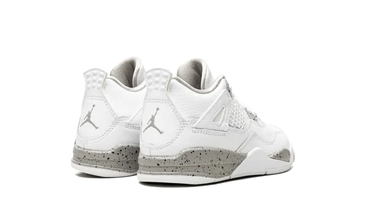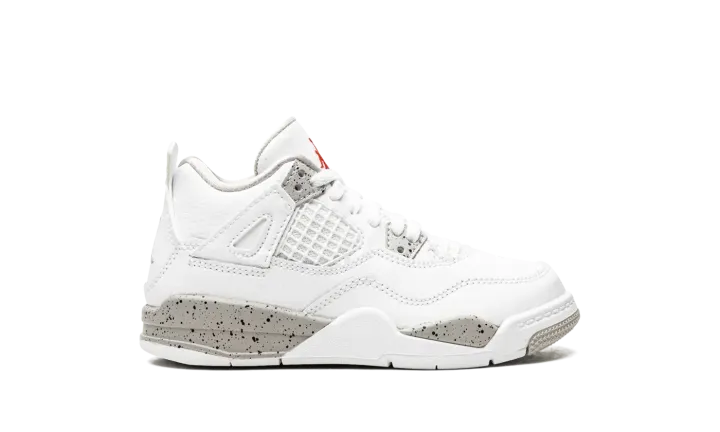 The Jordan 4 PS "White Oreo" is the preschool edition of the two-in-one colorway of Michael Jordan's fourth signature shoe that combines the "Oreo" and "White/Cement" styles into one design. A Summer 2021 release by Jordan Brand, the "White Oreo" is a predominantly monochromatic white iteration of the classic Air Jordan 4 that incorporates style elements of the two previously mentioned colorways into one look. Like the "White/Cement," the "White Oreo" features a white tumbled leather construction with cement grey speckling on the eyelets and on the painted midsole. White netting can be found on both the mid-panel and tongue. Jordan Brand paints the model's signature "wings" white and places a Fire Red embroidered Jumpman on the white leather tongue. A metallic silver Jumpman can be found on the heel. Release date: July 3, 2021