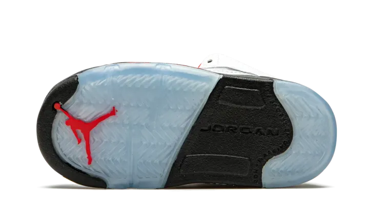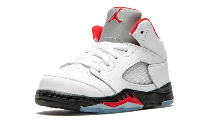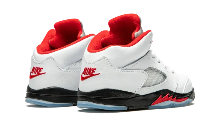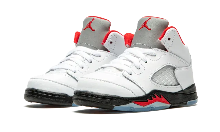 True white/fire red leather/rubber Air Jordan 5 Retro sneakers from JORDAN featuring round toe, flat rubber sole, front lace-up fastening, branded insole and signature Jumpman motif. These styles are supplied by a premium sneaker marketplace. Stocking only the most sought-after footwear, they source and curate some of the most hard to find sneakers from around the world.