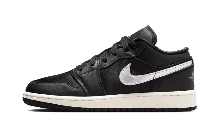 Step into the Air Jordan 1 Low SE PS "Black Metallic Gold," a preschool-sized special edition sneaker. This low-top shoe features a striking color scheme primarily composed of Black and Metallic Gold. It maintains the classic Air Jordan 1 design and uses a durable construction for an iconic look with lasting wear.