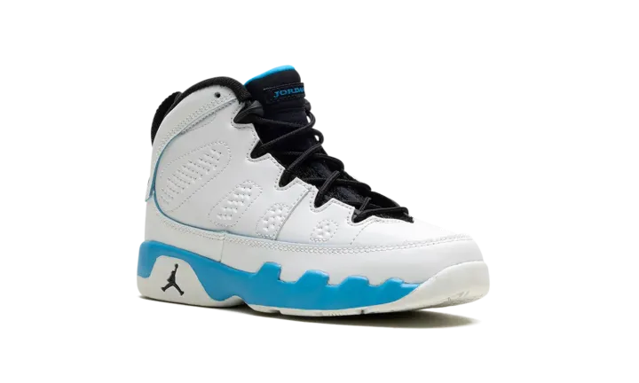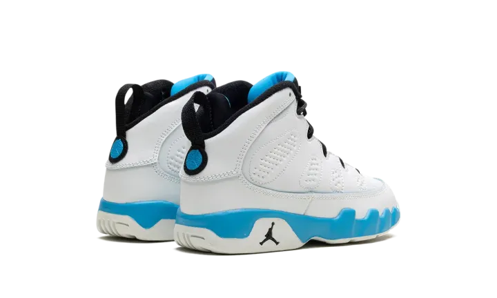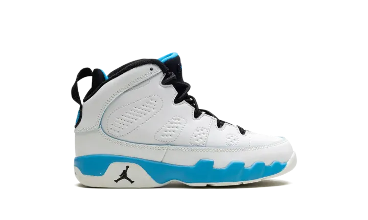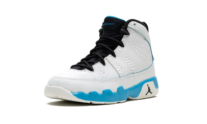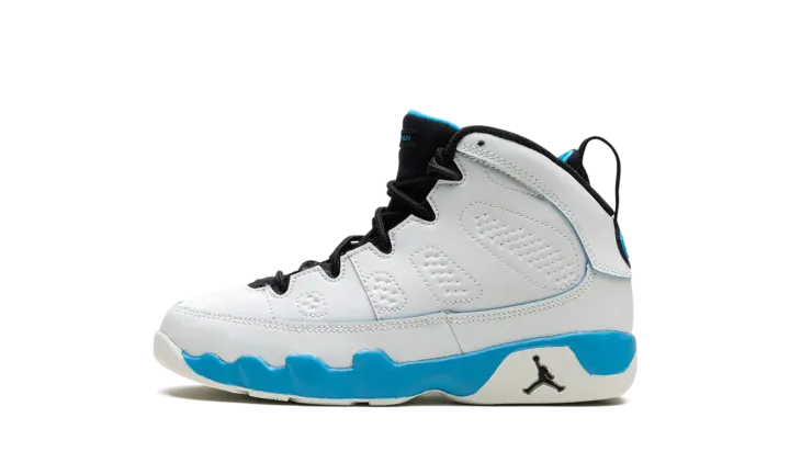 The Air Jordan 9 OG PS "Powder Blue" is the preschool sizing of the original colorway of the retro basketball shoe that debuted in 1993 before it was brought back in 2010 and here, in 2024. The modern version of the "Powder Blue" Jordan 9 is crafted in the spirit of the original style from '93. Moreover, the "Powder Blue" theme is inspired by Michael Jordan's alma mater, the University of North Carolina. The shoe is complete with a white leather construction with Powder Blue accenting on the midsole. The inner lining is also featured in Powder Blue, as is the "Jordan" branding on the tongue, and the "globe" emblem on the heel. A small Jumpman on the side of the heel of the midsole completes the look of this classic sneaker.