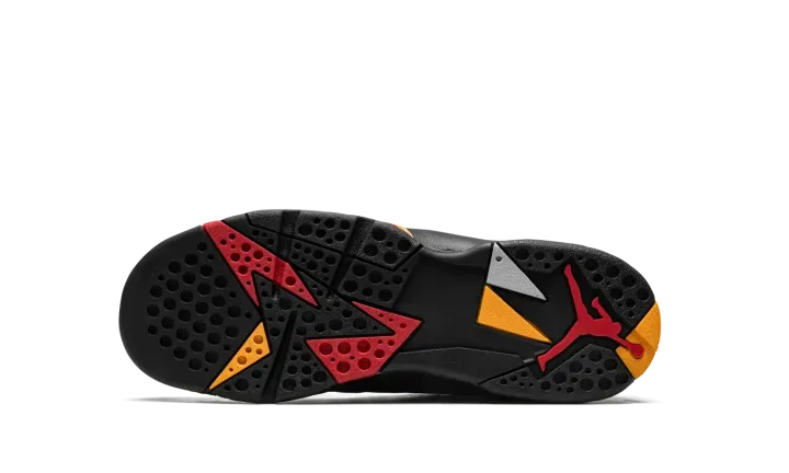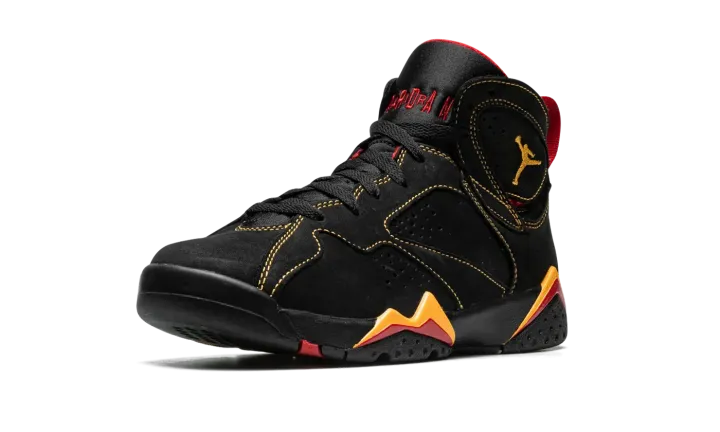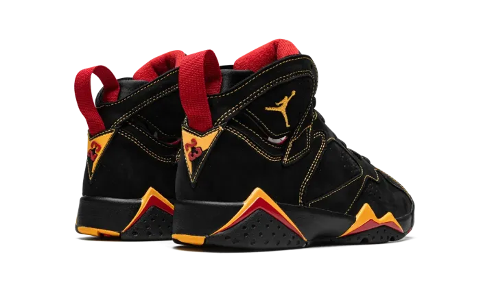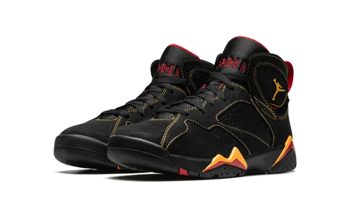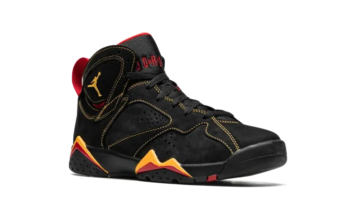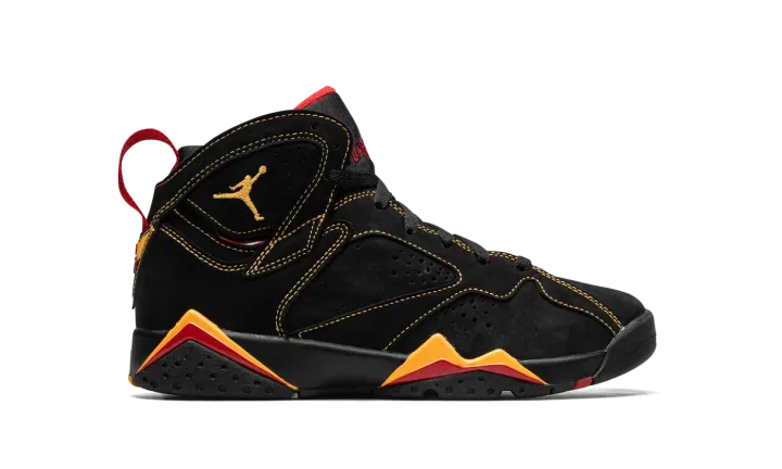 The Air Jordan 7 GS "Citrus" is the youth sizing of a popular non-original colorway that debuted in 2006 before returning as part of the retro basketball shoe's 30th anniversary celebration in 2022. The modern "Citrus" is nearly identical to the version that was originally released back in the mid-aughts, and it doesn't disappoint in the slightest bit. Design wise, the shoe features a black-based synthetic nubuck upper with contrasting yellow stitching on each overlay along with red accents on the sockliner and midsole. A Citrus-colored Jumpman appears on the collar. Classic "23" branding is found on the heel. Burgundy-colored "Air Jordan" detailing is found on the black neoprene tongue tongue. Release date: August 13, 2022