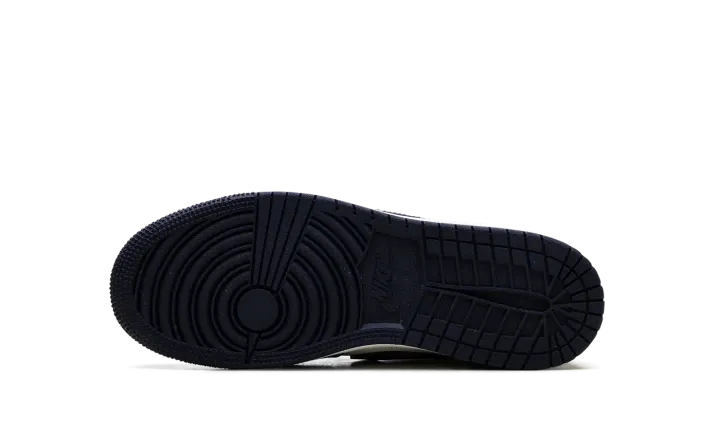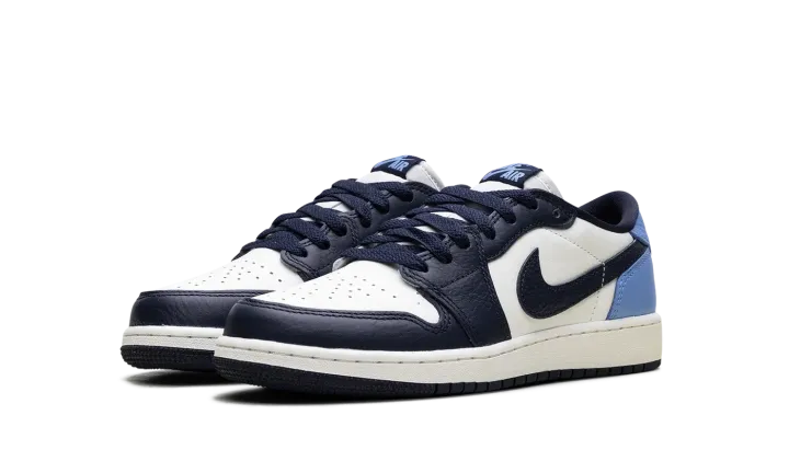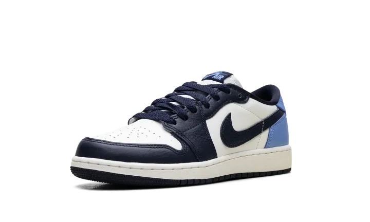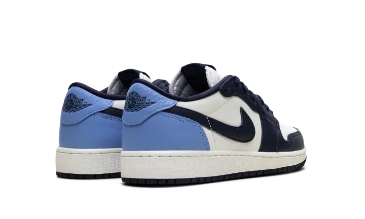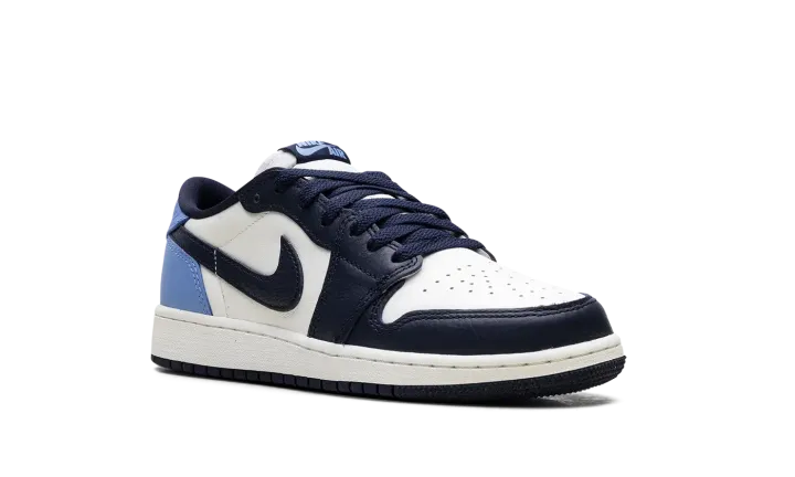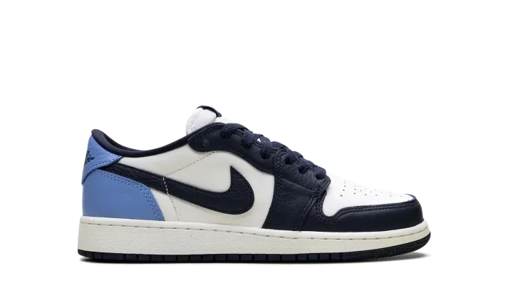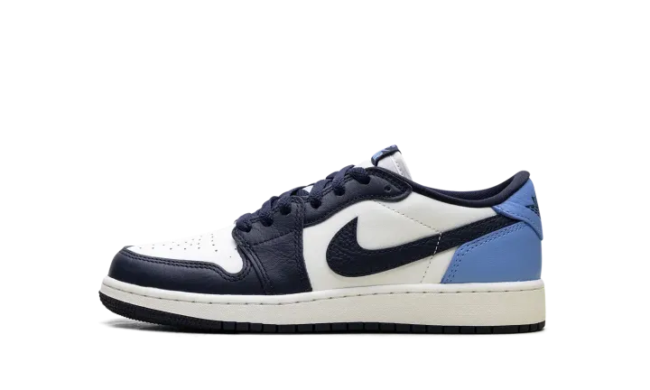 The Air Jordan 1 Low GS "Obisidian" is the grade school version of the 2025 lowtop. The kids' AJ1 Low OG "Obisidian" has a leather upper that combines shades of navy and light blue with off-white. The lowtop Jordan 1 has a Wings logo on the heel and a navy Swoosh.