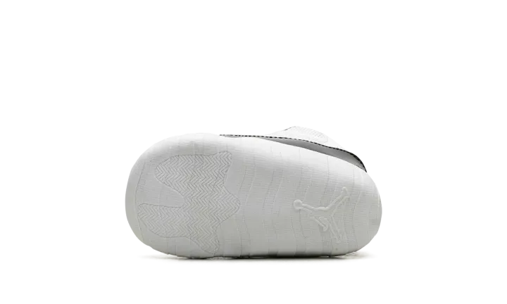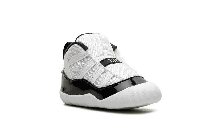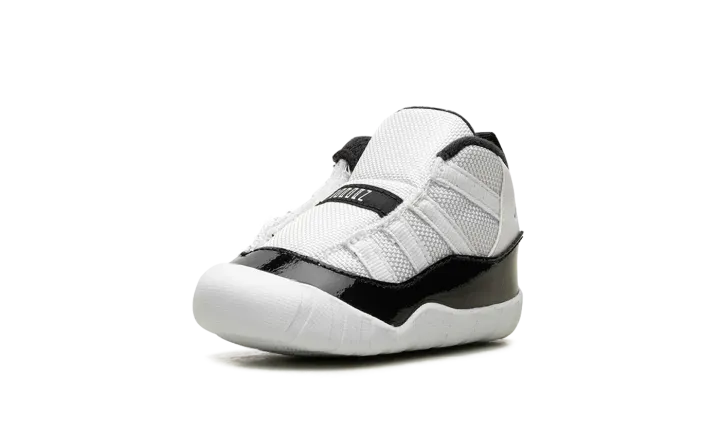 The Air Jordan 11 Crib "Gratitude" is the infant sizing of the Holiday 2023 Air Jordan 11 release. Also nicknamed the "Defining Moment Pack" or simply "DMP" colorway, the Jordan 11 "Gratitude" is based on the retro basketball sneaker's original "Concord" colorway that was worn by Jordan with the Chicago Bulls throughout the team's historic run during the 1995-96 NBA season. The upper features a white ballistic mesh construction with white leather appearing on the heel. A glossy black patent leather mudguard contrasts the shoe's neutral base. Metallic Gold Jumpman branding is found on the collar. Release date: December 9, 2023