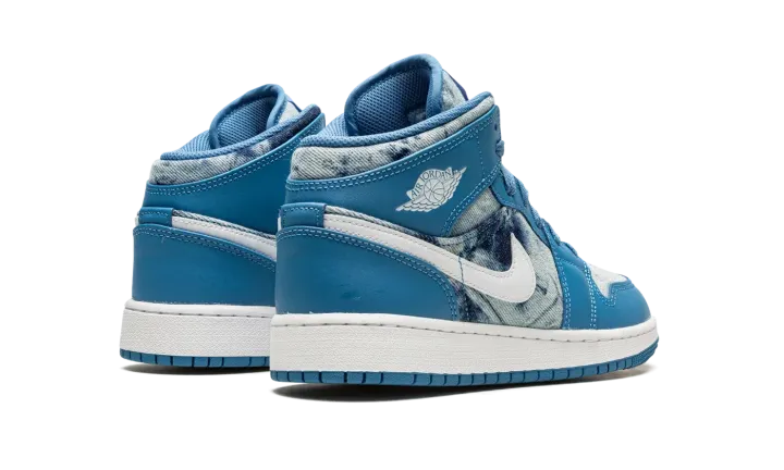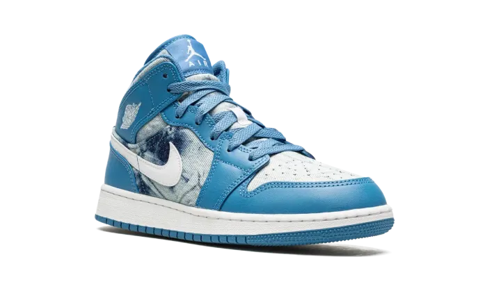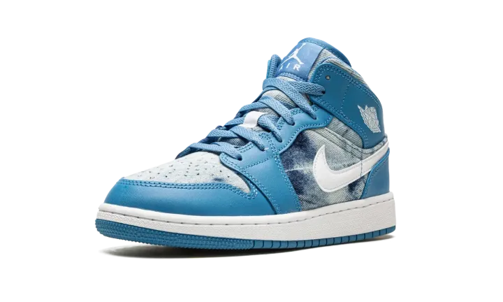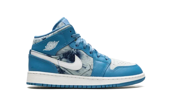 The Air Jordan 1 Mid GS "Washed Denim" brings another unique look to the celebrated sneaker. The eye-catching colorway features a bleached denim material for its base, while the leather overlays around the forefoot, tongue and across the heel sport a rich blue hue. Profile Swooshes and wings insignias on the lateral ankle flap favor a clean white look, which also lands on the midsole underfoot.
