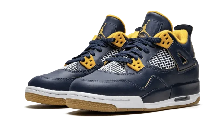 Part of the "Dunk From Above" collection from Jordan Brand in 2016, this Air Jordan 4 features a unique colorway in navy blue leather with yellow and white accents, all finished with a gum rubber outsole. This listing is for Grade School sizing.