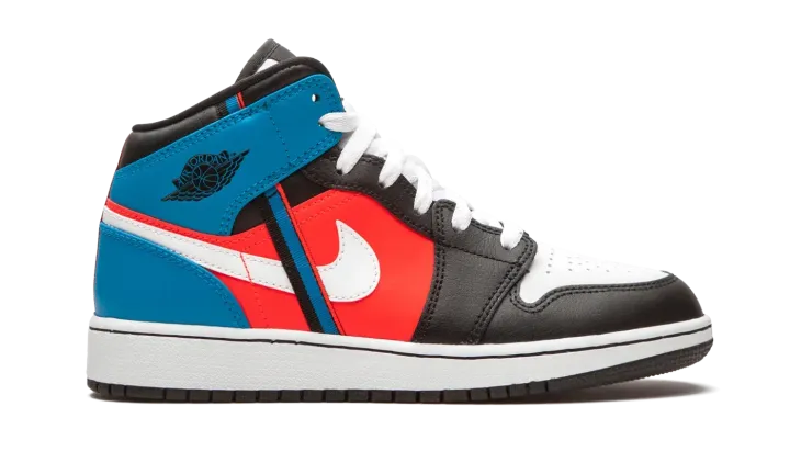 The Air Jordan 1 Mid GS "Game Time" is a new multicolor makeup of Michael Jordan's first signature shoe in youth sizing. This Jordan 1 Mid features an intriguing mixture of colors that appeals to children. The upper features white perforated leather on the toe and smooth white leather on the Swoosh that dots either side of the shoe. Contrasting black leather overlays on the forefoot, eyelets, and collar breakup the appearance. Bold pink leather can be found on the mid-panel. A vertical two-tone blue and black nylon stripe spans from the blue leather collar overlay to the midsole for a unique detail. Black "Wings" detailing appears on the collar.