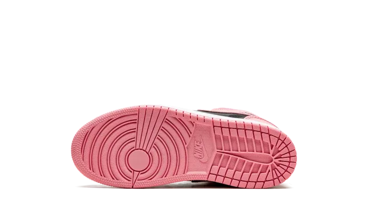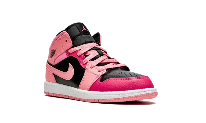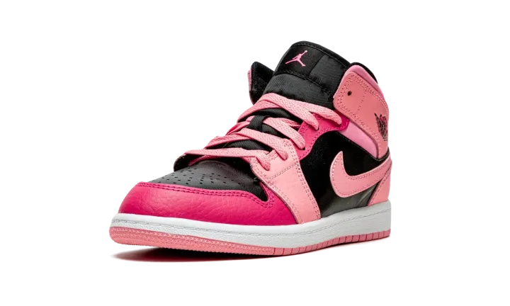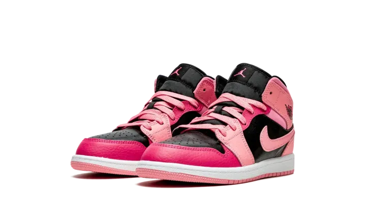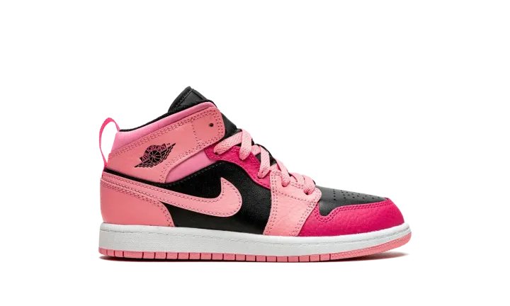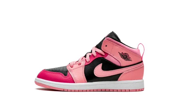 The Jordan 1 Mid PS "Coral Chalk" is the preschool version of the popular retro basketball shoe in a multicolor look that features various shades of pink on its design. A fun colorway for children, the "Coral Chalk" has a base of black leather on the perforated toe and mid-panel. The forefoot, collar, heel, and Swoosh are designed in Coral Chalk-colored leather and contrast the neutral appearance of the shoe's base. Rose Pink leather is found on the toe cap and middle eyelet panel, and on the nylon heel tab that assists with easy on-off wearability. A pink Jumpman is found on the tongue tag and a black "Wings" logo is located on the collar. The look is rounded into form with a white midsole and pink rubber outsole.