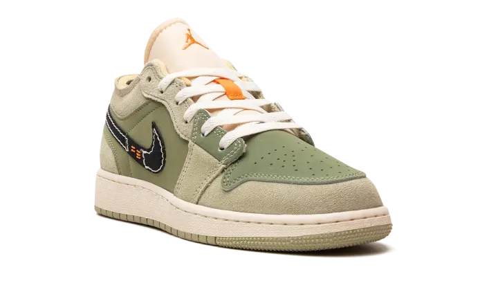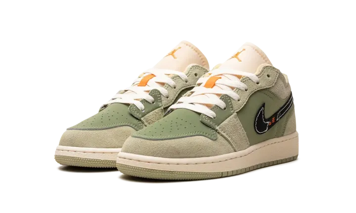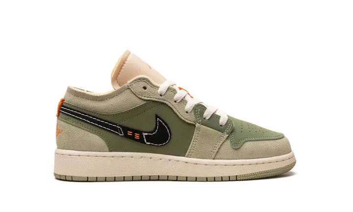 The Air Jordan 1 Low Craft SE GS "Light Olive" is the youth sizing of the casual sneaker with a military-inspired vibe. The Jordan 1 Low Craft SE modifies the retro basketball shoe's design with an inside-out aesthetic. More specifically, the upper is complete with raised Light Olive leather on the perforated toe and mid-panel. The overlays are designed in a slightly lighter shade of olive green suede. Black Swooshes appear on the side panels with exposed stitching. Exposed foam padding peers out from the top of the tongue and on the collar. Release date: October 1, 2023