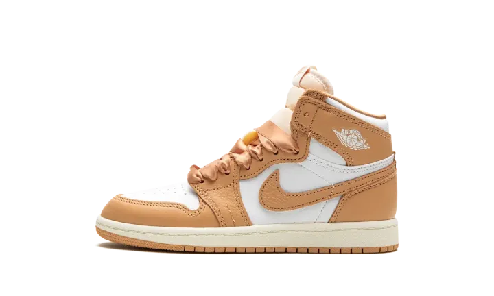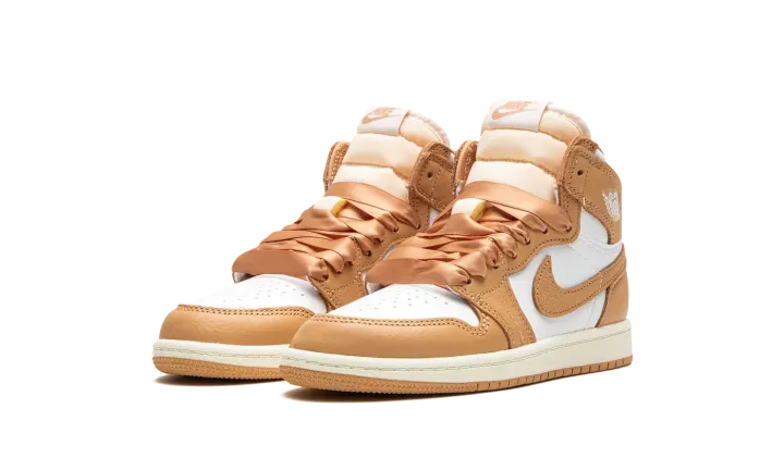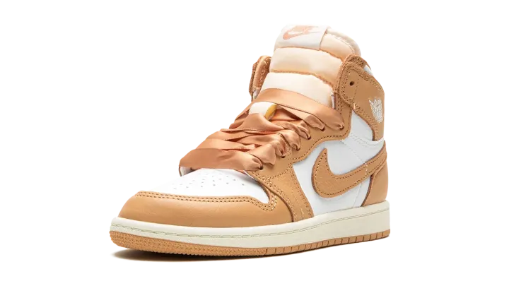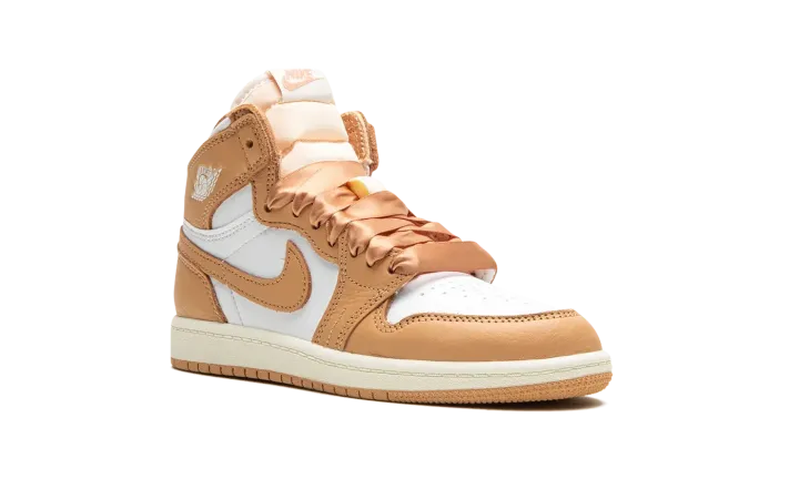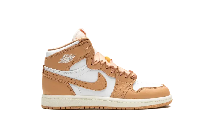 The Air Jordan 1 High OG PS "Praline" is the preschool sizing of the retro basketball shoe with a luxurious vibe. Released in women's sizing for adults, the "Praline" Jordan 1 High OG was also produced in children's sizes. The shoe's design features a white leather upper contrasted with Praline, or tan, leather overlays and a Praline leather Swoosh. Satin ribbon-style laces replace the Jordan 1's original laces for an opulent look. Other details include a white "Wings" logo on the collar and a Praline-colored Nike logo on the tongue tag. Underfoot, a cream rubber midsole and tan rubber outsole complete the look. Release date: September 13, 2023