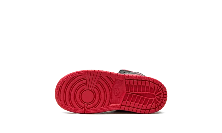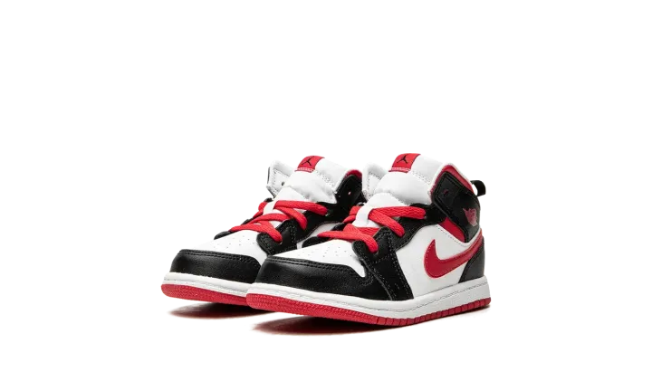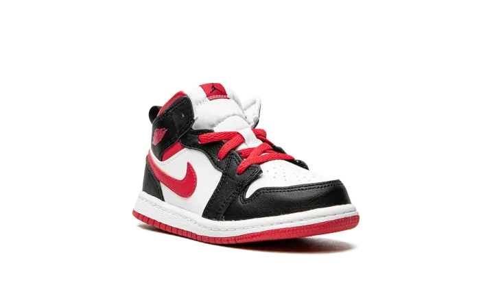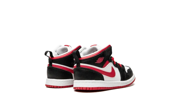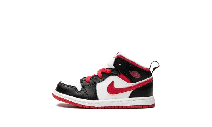The Jordan 1 Mid TD "Very Berry" is the toddler sizing of the mid-top lifestyle shoe in a colorway that loosely pays homage to the Chicago Bulls, Michael Jordan's former basketball team. The "Very Berry" Jordan 1 Mid TD features a white leather upper with contrasting black leather overlays on the toe, forefoot, eyelets, collar, and heel. A Very Berry shade of red is found on the side Swooshes. The collar overlays features a "Wings" logo in red. Additional branding appears on the red nylon tongue tag with a black Jumpman logo. A white midsole and red rubber outsole complete the look.