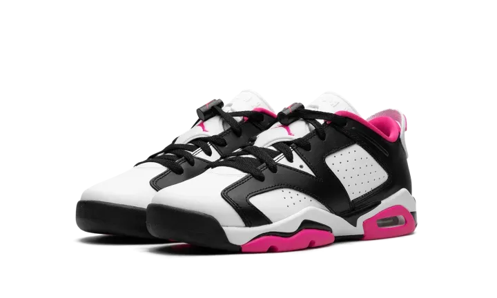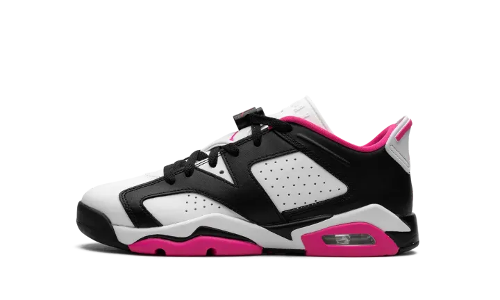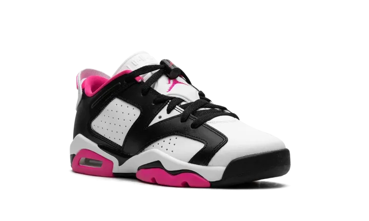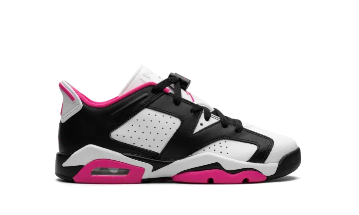 The Air Jordan 6 Low GS "Fierce Pink" is the youth sizing of the low-top retro basketball sneaker in a can't-miss colorway. The Jordan 6 Low "Fierce Pink" was released exclusively in children's sizes and features a white base contrasted with black leather overlays. Fierce Pink accenting lands on the Jumpman on the tongue, on the inner lining, on the pull tab on the heel, and on the outsole. Underfoot, the shoe is complete with a white rubber midsole that's placed on a black and pink rubber outsole. Release date: July 24, 2023