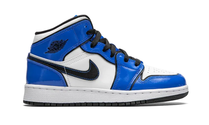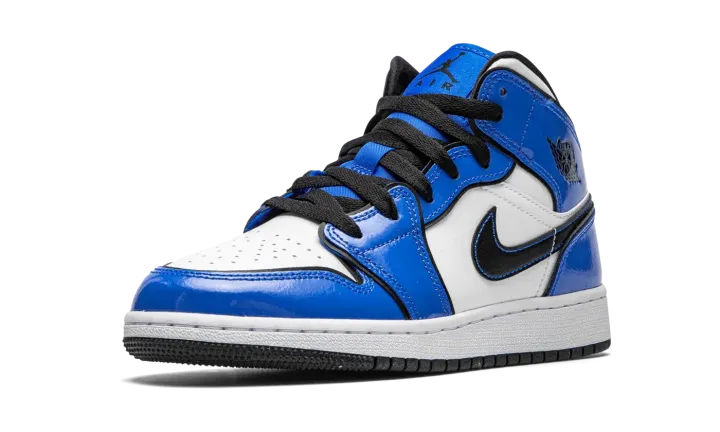 The Air Jordan 1 Mid GS "Signal Blue" is the youth sizing of Michael Jordan's first signature shoe in an Orlando Magic inspired colorway for kids. The Air Jordan 1 Mid is as popular as it's ever been in recent years due to refreshing looks like the "Signal Blue" that add to the iconic silhouette's story. Jordan Brand adds shining patent leather overlays in the shade of royal blue to the forefoot, eyelets, collar, and heel. The same hue of blue also appears on the tongue and nylon tongue tag with black Jumpman branding. Blue contrast stitching borders the black leather Swoosh and a black "Wings" insignia is located on the collar. The perforated toe, mid-panel, and collar are finished off in white leather to complete the look.