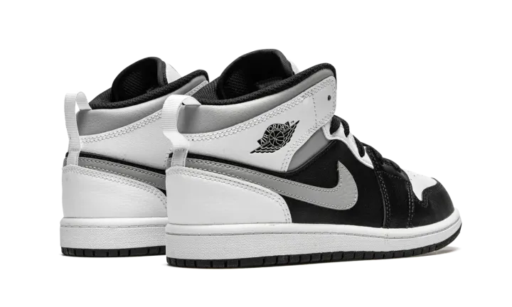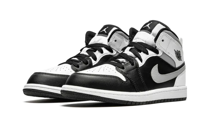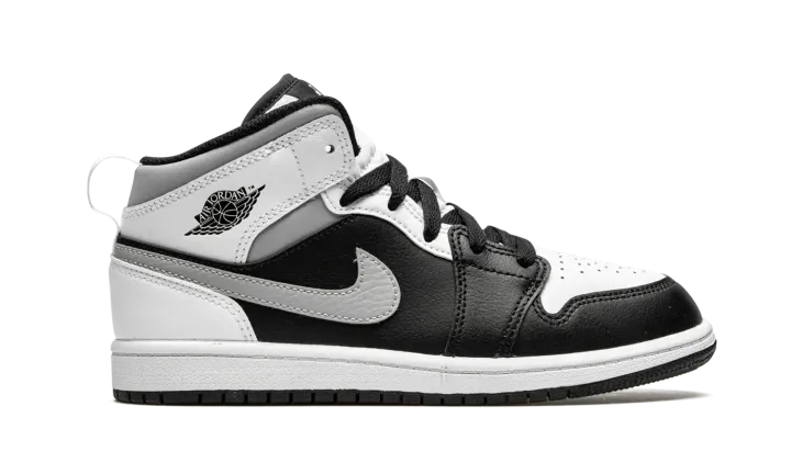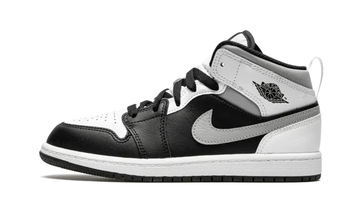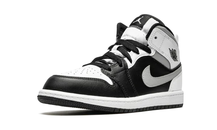The Air Jordan 1 Mid PS "White Shadow" is the preschool sizing of Michael Jordan's coveted first signature shoe in an easy-to-style colorway. The "White Shadow" appears on the Jordan 1 Mid silhoutte, one of the most popular looks in Jordan Brand's line. Design details include buttery black leather on the toe cap, forefoot, and mid-panel. Contrasting white leather can be found on the perforated toe box, middle eyelet panel, collar, and heel. Branding appears in the form of a grey leather Swoosh on either side, a black "Wings'" emblem on the collar, and white Jumpman on the tongue tag sewn onto the white nylon tongue. The white pull tab on the heel is a helpful design that makes wearing and taking off the shoe a breeze.